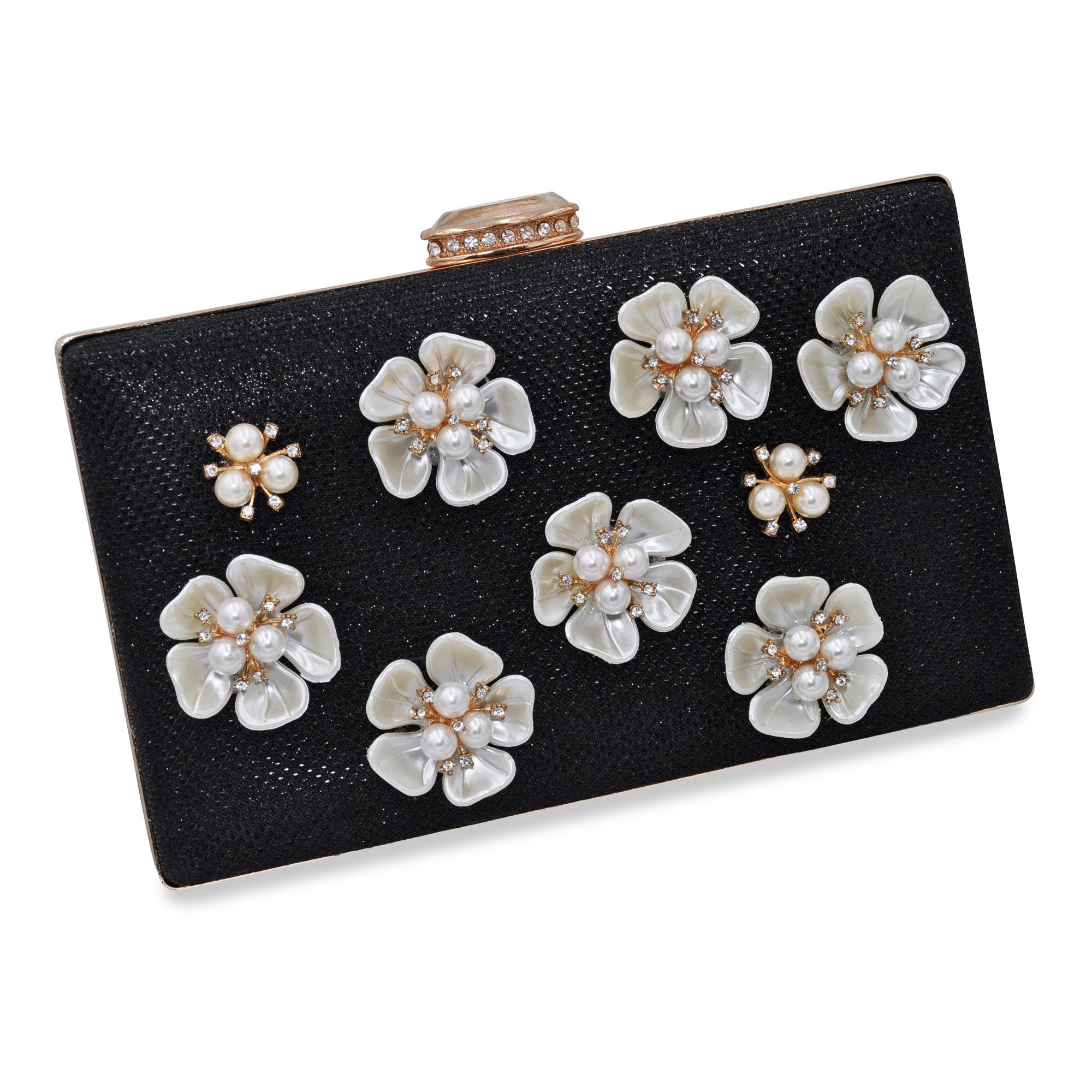 Glitzer-Abendtasche in schwarz mit weißer Blütenzierde mit Perlen und funklenden Glassteinen verziert. Die Tasche ist ca. 20cm lang und 35cm breit. Die Kettenlänge beträgt 120cm.