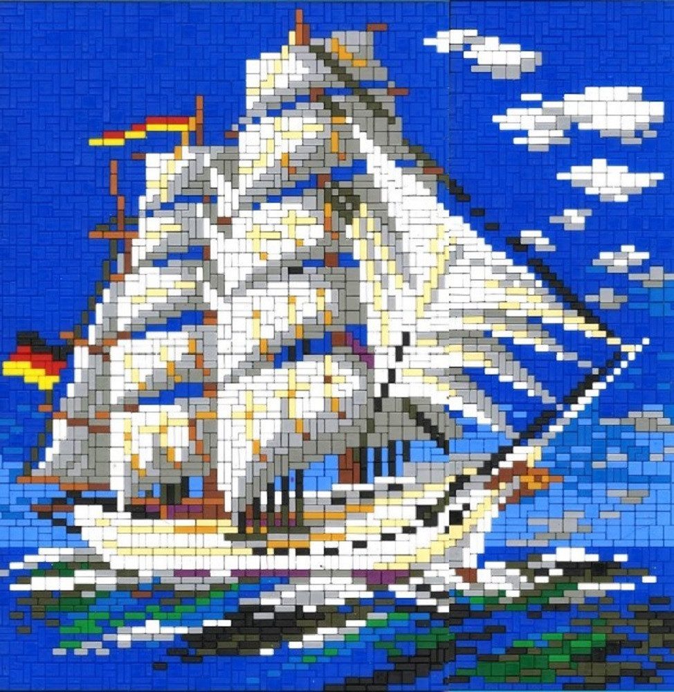 Lieferumfang | 1 XXL-Steckvorlage 2 Seiten DIN A3 9 Steckplatten 13,3 x 13,3 cm 1 Hebel 2 Aufhänger 24 Verbindungsscheiben ca. 5.000 Mini-Stecksteine |