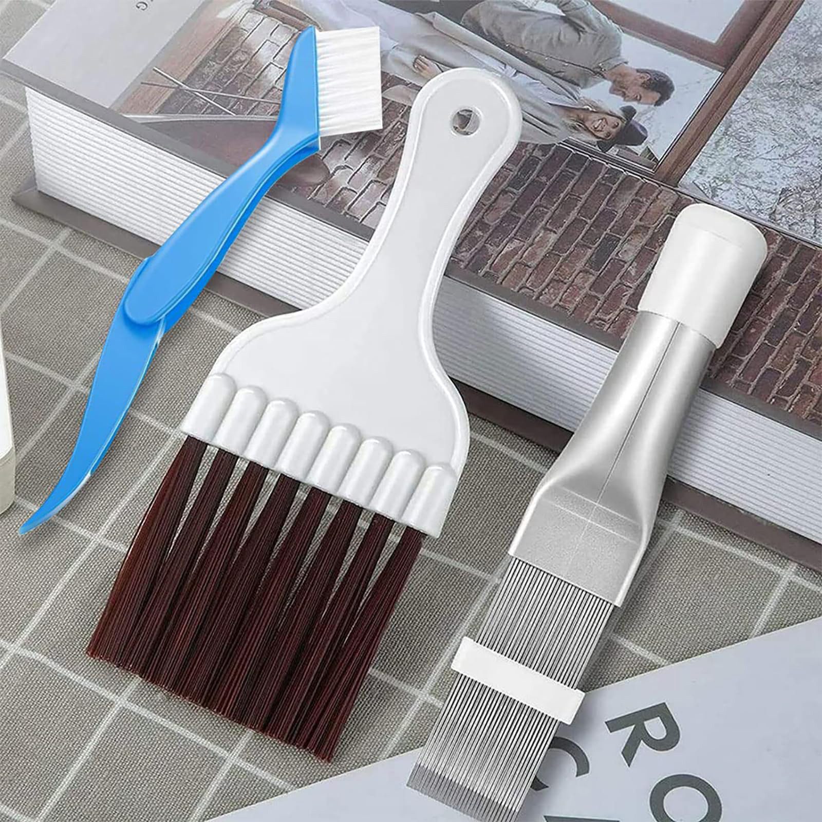 Das Set umfasst eine braune Borstenbürste, einen Metalllamellenkamm und einen blauen Klapp-Pinsel – perfekt aufeinander abgestimmt für eine gründliche und vielseitige Reinigung Ihrer Klimaanlage.