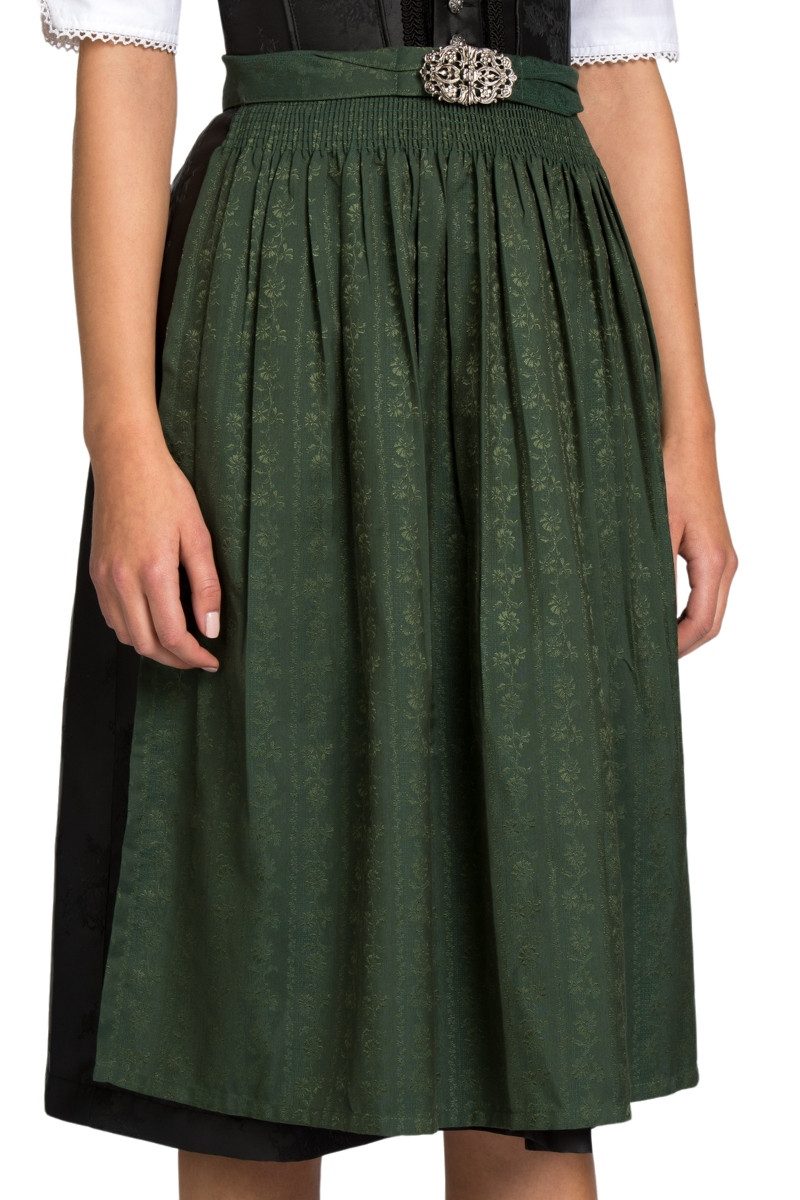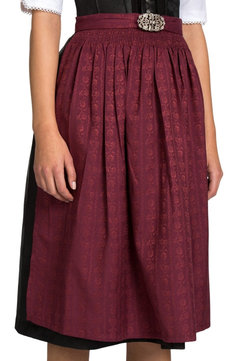Diese edle Jacquard-Dirndlschürze ist mit einem zauberhaften Blumen-Webmuster verziert. Das Streifen-Muster aus blumigen Ranken hat einen beeindruckenden Changier-Effekt, der je nach Lichteinfall in Bordeaux oder Tanne schimmert. Am Bund ist die Schürze gehanselt, was für einen schönen Faltenwurf sorgt. Sie wird mit einer zweiteiligen, silberfarbenen Schließe im Ornamentik-Ajour-Stil zum Einhaken verziert. Sie ist perfekt zum kombinieren. Die Schürze wird ohne Dirndl geliefert. Sie ist auch in den Farben Altrosa und Blau (AW-18333) in unserem Shop erhältlich.