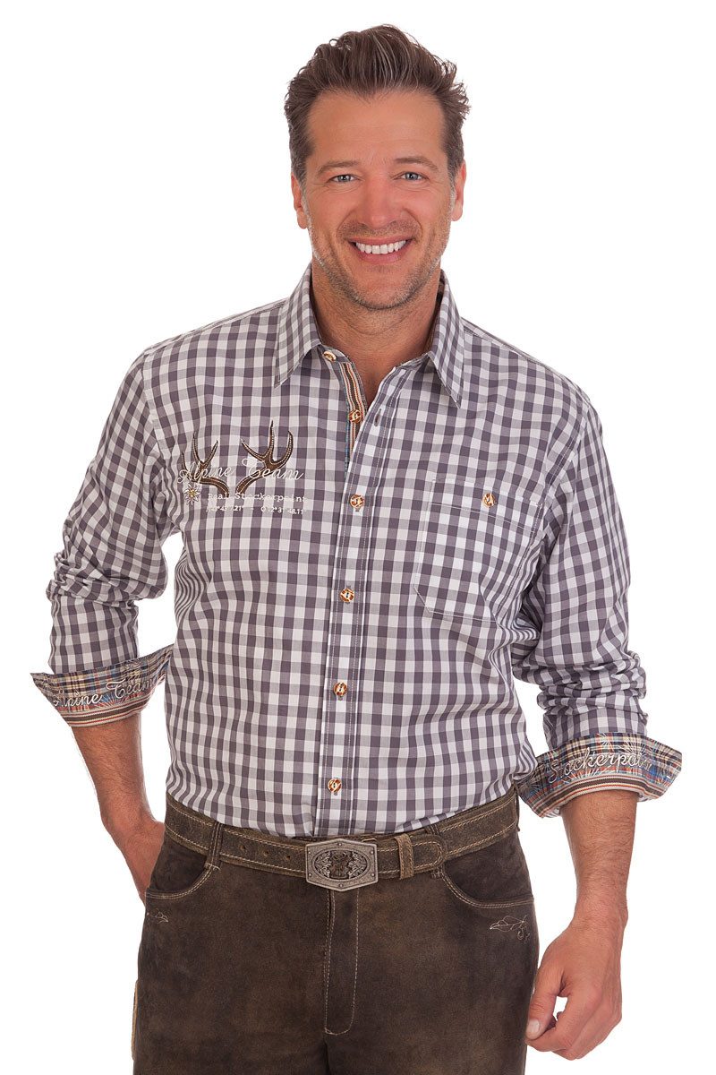 Ein trendiges Karo-Hemd für Herren mit klassischem Schnitt, Kentkragen und leicht abgerundetem Saum. Die bestickten Kontrastmanschetten und modischen, großen Karos verleihen dem Hemd eine moderne Note. Auf der rechten Brust befinden sich ein gesticktes Edelweiß und ein Schriftzug mit Lederapplikation, die für einen besonderen Akzent sorgen. Eine aufgesetzte Brusttasche mit Knopfverschluss bietet praktische Funktionalität, während das Lederimitat an der Krageninnenseite und der Kontraststoff an der Knopfleiste stilvolle Details hinzufügen. Abgerundet wird das Design durch Knöpfe in Hirschhornoptik.