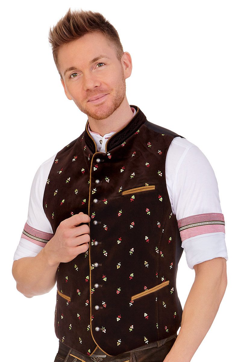 Festliche Samtweste im trendigen alpinen Style! Junges Design in frischen Farben, hochwertiger Samt, traditionelle Kugelknöpfchen (Metall) und Blümchenstickereien machen diese Weste zu einem tollen Kombipartner! Der Westenrücken ist aus schwarzen Satin gearbeitet und mit einem Rückenriegel flexibel einzustellen. Taschen vorn nur optisch angedeutet. Super bequem, cool und urig! Ein Muß zu jeder Lederhose!