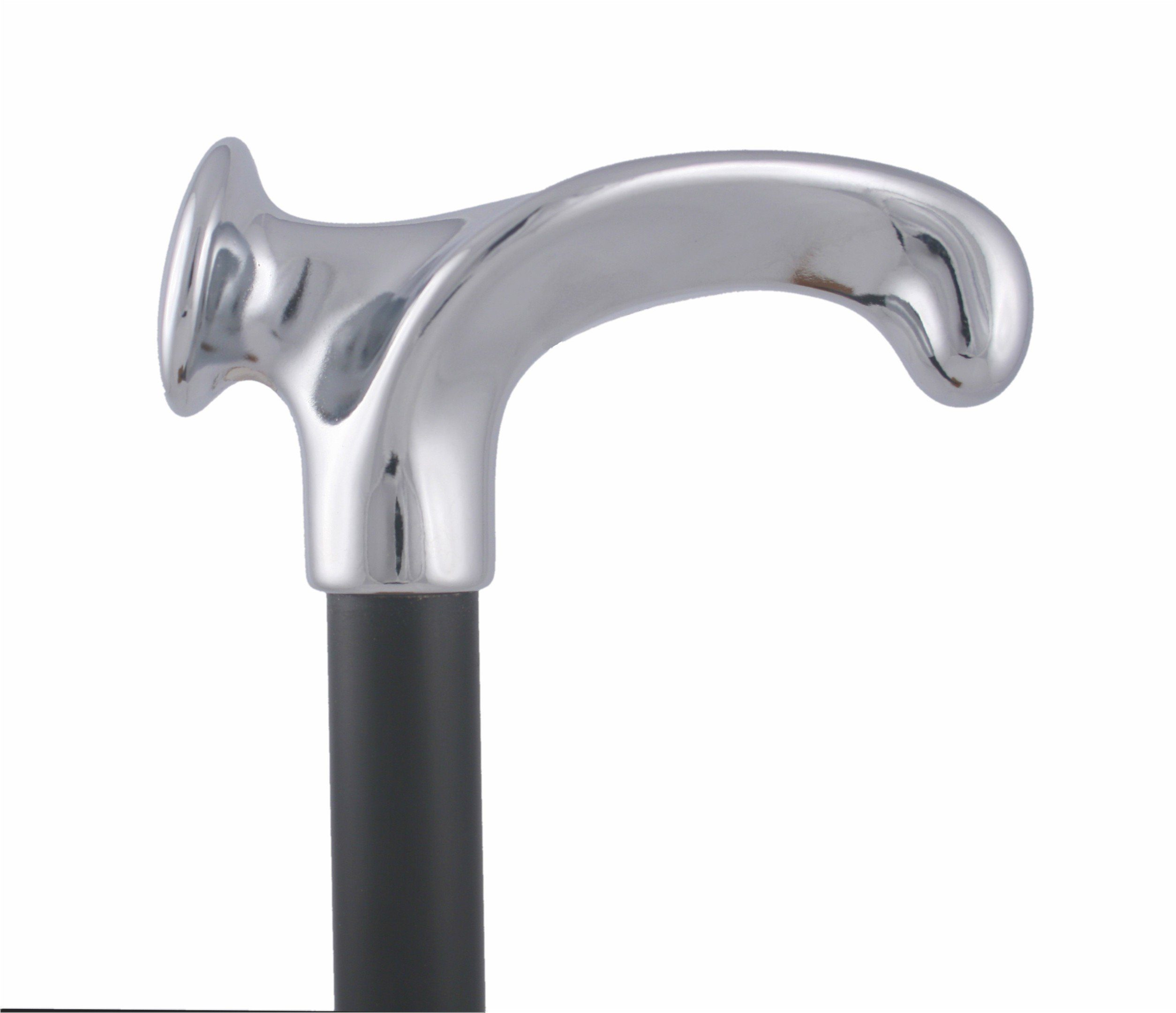 Der formschöne Derbygriff ist glanzverchromt und anatomisch für die rechte oder linke Hand geformt. Der hochstabile ABS Kunststoffgriff mit Schmuckring ist auf einen seidenmatt schwarz lackierten Stock aus Buchenholz aufgesetzt und schließt mit einem eleganten Gummipuffer ab.