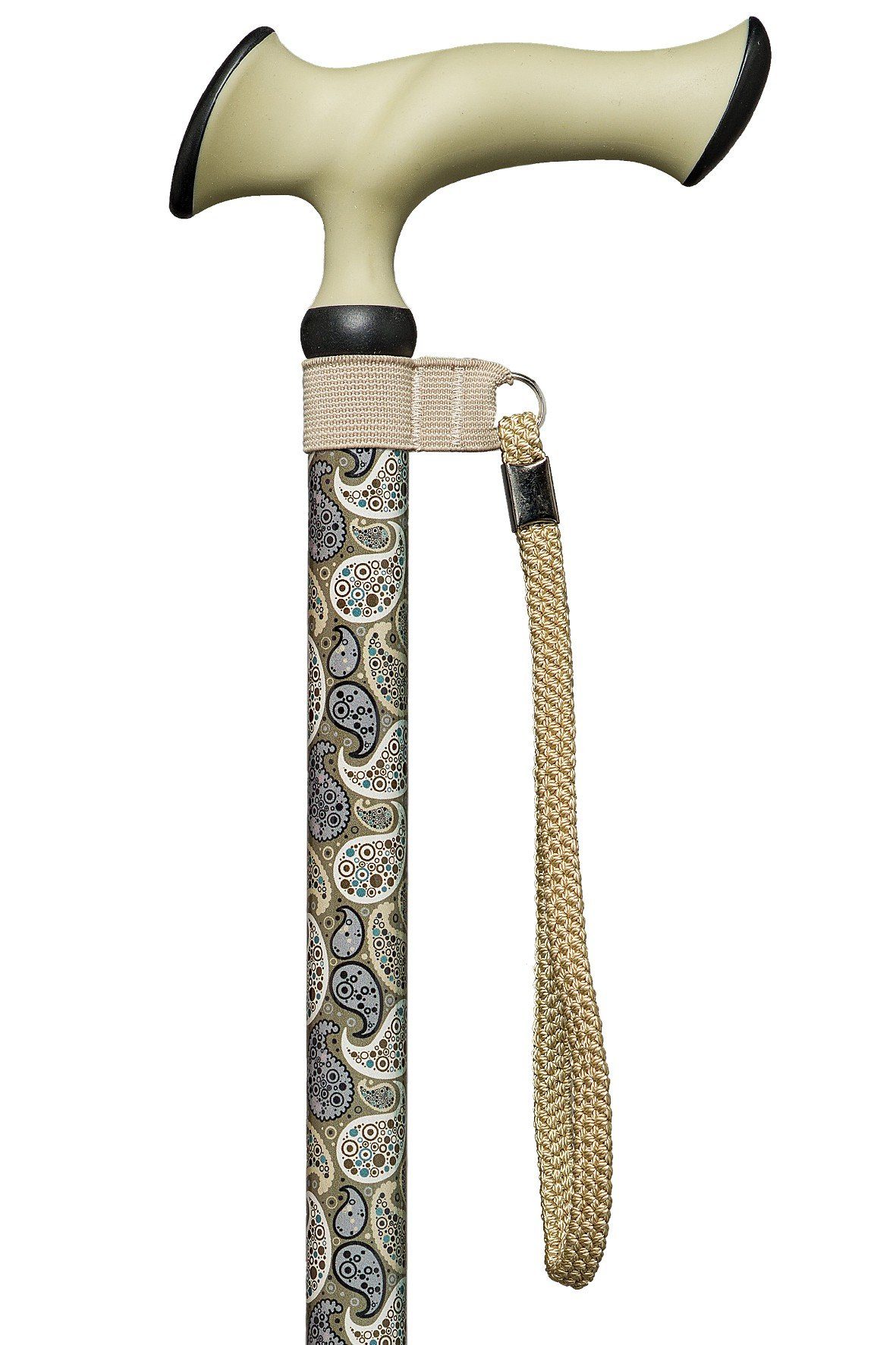 Ein besonders stabiler, bequemer Griff aus Kunststoff, ummantelt mit einem weichen Gummimaterial und einem Dämpfungspolster auf der Oberseite. Aufgesetzt mit einem Schmuckring auf einen Stock aus Leichtmetall mit modernem Paisleymuster, höhenverstellbar von ca. 75 bis ca. 100 cm Gesamtlänge. Inklusive farblich passendem, stabilen Gummipuffer.