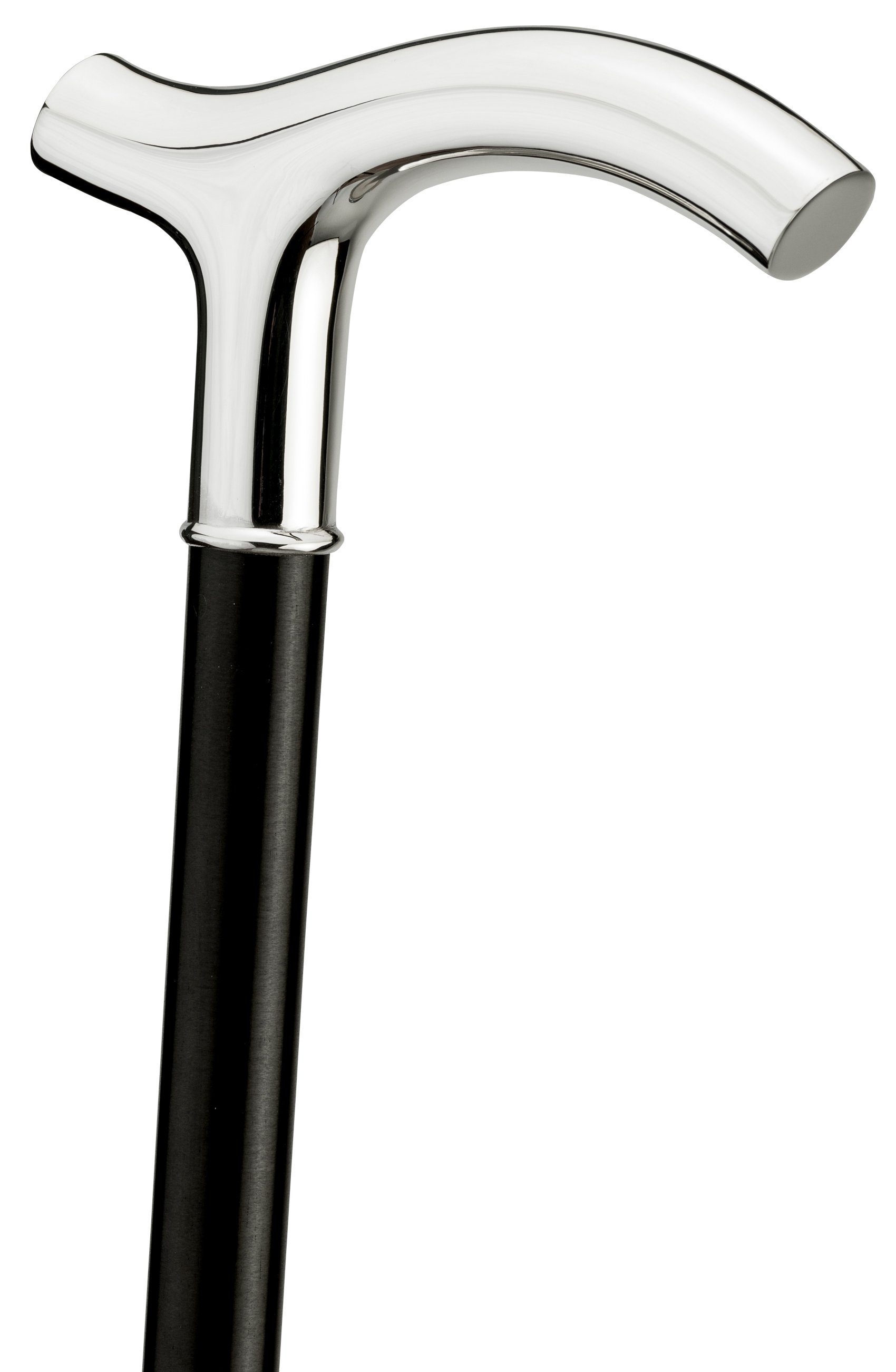 In deutscher Silberwerkstatt handgefertigter Fritz-Griff aus hochwertigstem, 925/1000 Sterlingsilber. An der Vorder- und Rückseite des Griffes werden glatte Gravurplatten (Durchmesser 20mm) eingearbeitet. Aufgesetzt wird der Griff klassisch auf einen Stock aus edlem, leicht zart braun gemasertem Makassar-Ebenholz, der mit einem schlanken Gummipuffer abschließt.