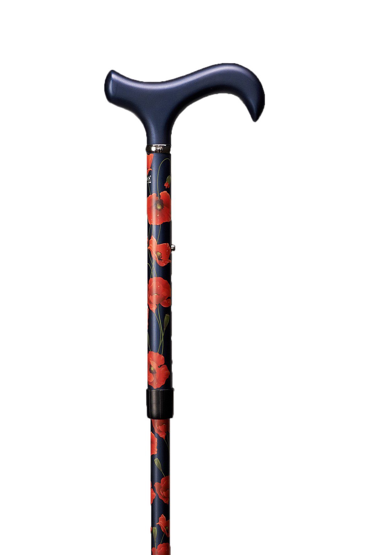 Ein schlanker, dunkelblauer Derbystock, Griff aus Carbon, Leichtmetall-Stock mit einem schönen, roten Mohnblumen-Dekor, Matt-Finish, höhenverstellbar und mit passendem Gummipuffer als Abschluss.