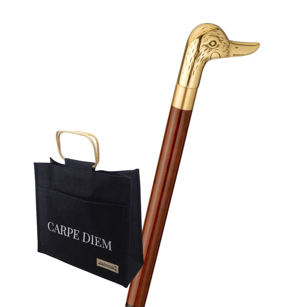 Dieser edle Geschenkstock von Stockshop.de besteht aus insgesamt fünf Teilen. Der Griff aus massivem Messing-Guss in Form eines Entenkopfes lässt sich mittels einem Metallgewinde leicht vom Stock abschrauben.