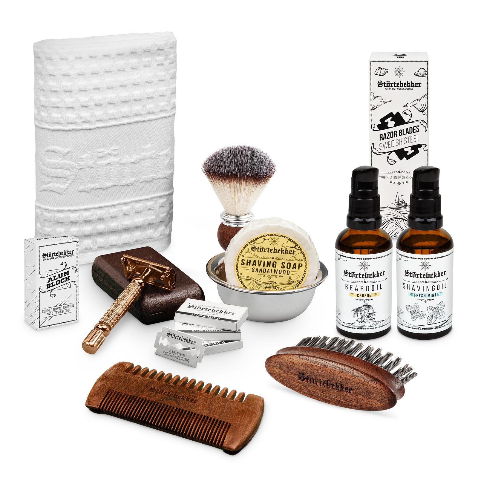 Lieferumfang | Rasierhobel Rasierpinsel Rasierschale Rasierseife Rasierklingen Alaunstein Rasiertuch Rasieröl Bartkamm Bartbürste Bartöl |