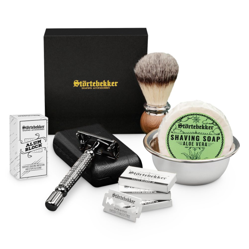 Besondere Merkmale | mit Rasierpinsel, Rasierschale, Rasierseife, Alaunstein und 10 Klingen |