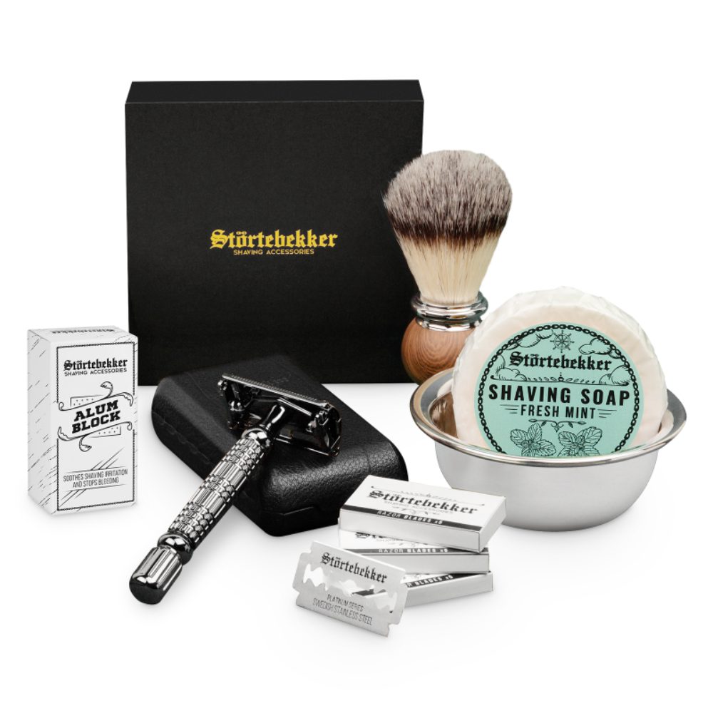 Lieferumfang | Rasierhobel 'Hamburg' inkl. Lederetui und 10 Rasierklingen Rasierpinsel-Set inkl. Rasierpinsel, Rasierschale und Rasierseife Alaunstein |