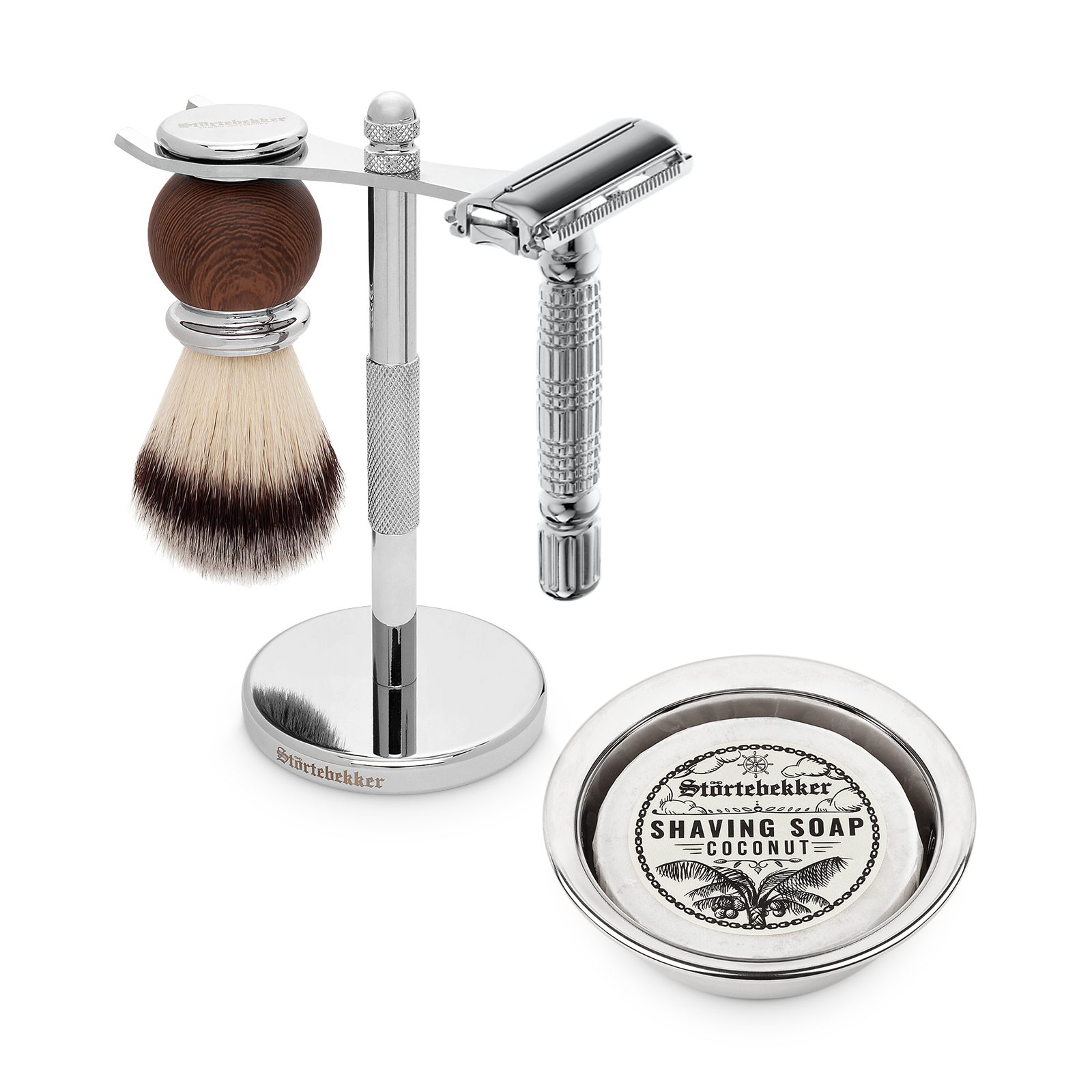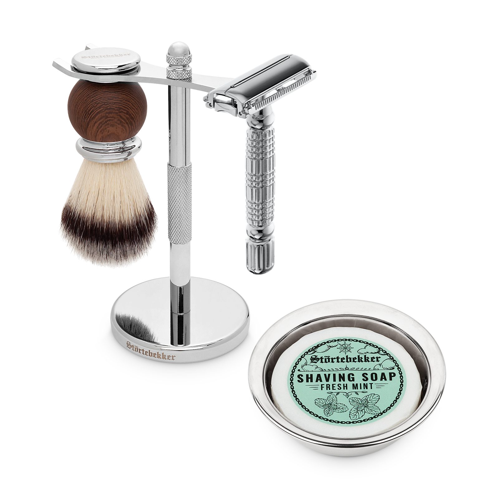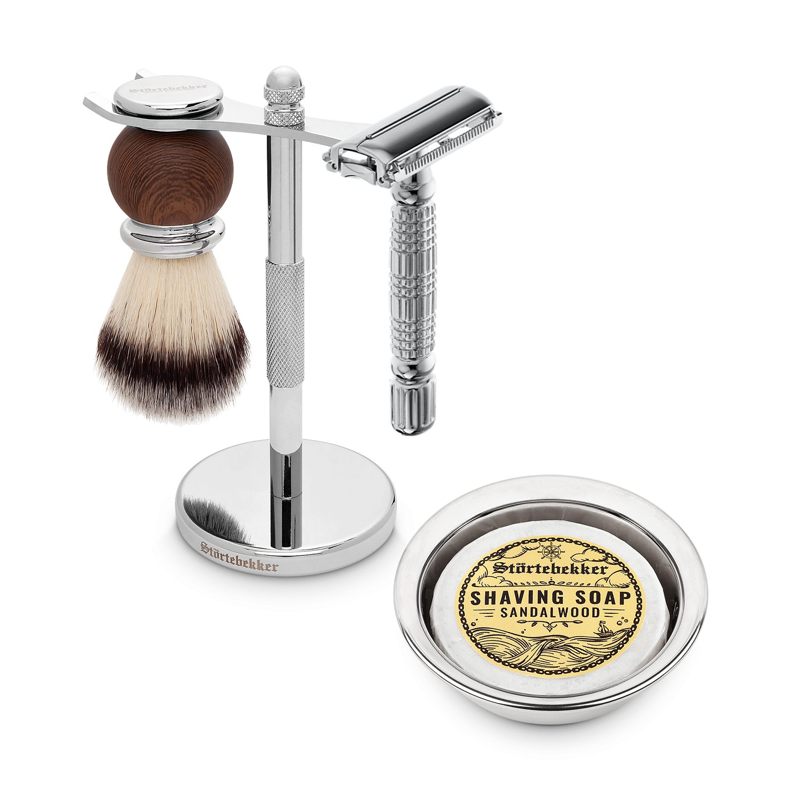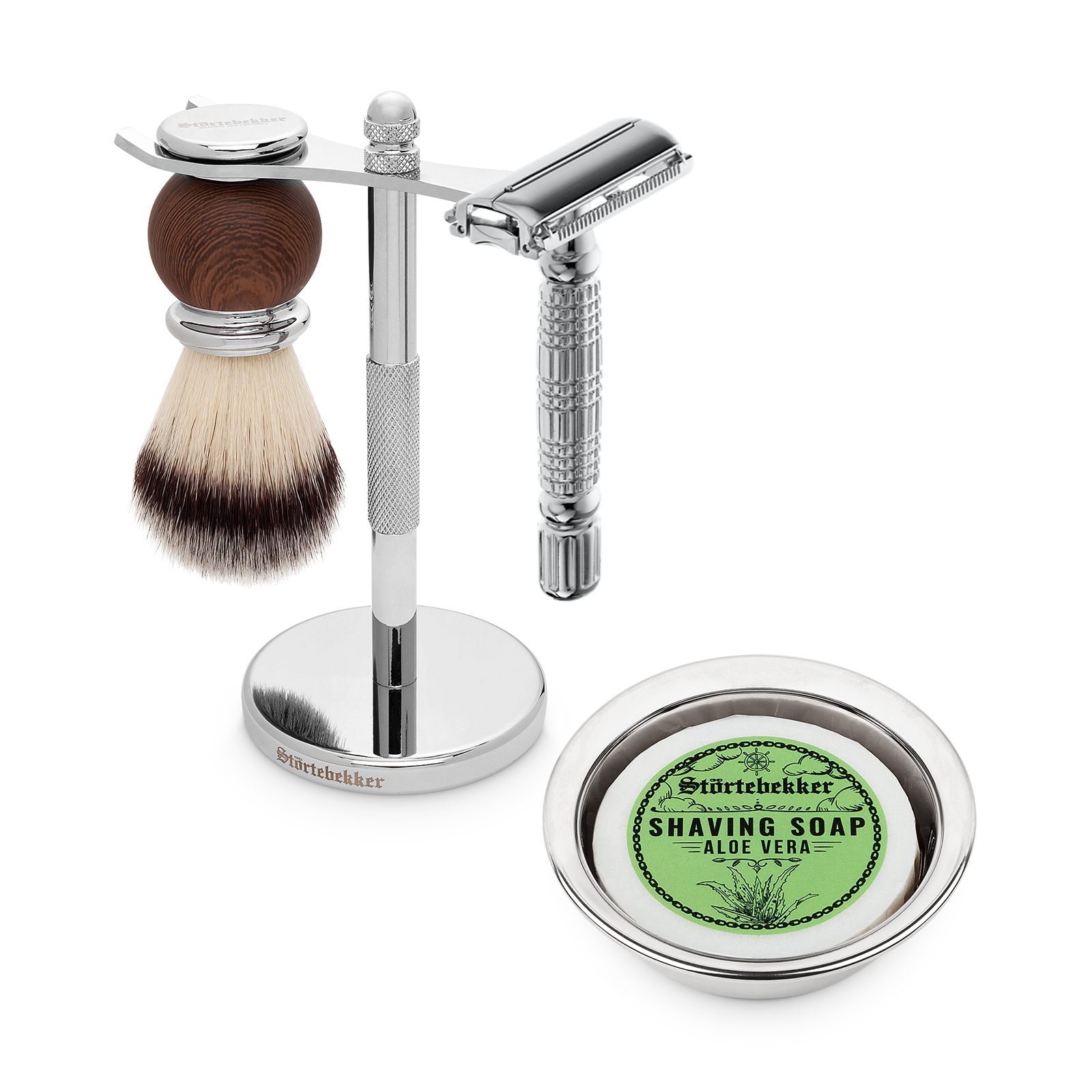 Ausstattung | Rasierhobel Rasierpinsel Rasierschale Rasierständer Rasierseife Lederetui 10 Störtebekker-Klingen |