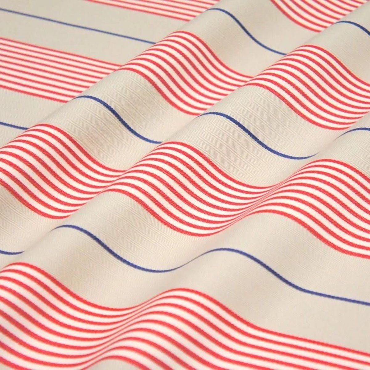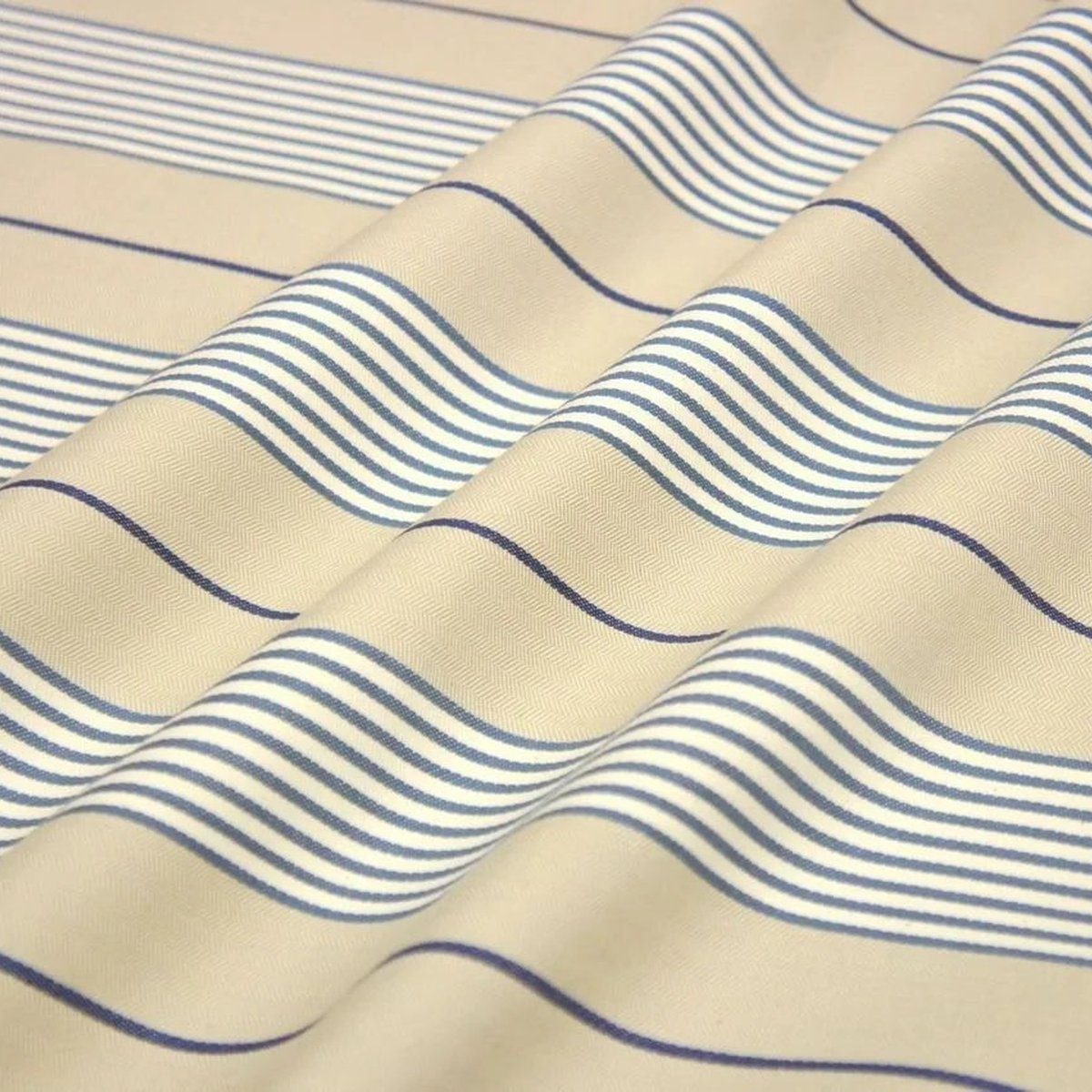 280cm hoher, gewebter Streifen-Dekostoff mit feinem Chevron Muster. Beige farbiger Fond und blauer Streifen. Dieser Stoff eignet sich wunderbar für Kissenbezüge, Hussen, Tischwaren, Vorhänge oder für andere Dekorationsmöglichkeiten.