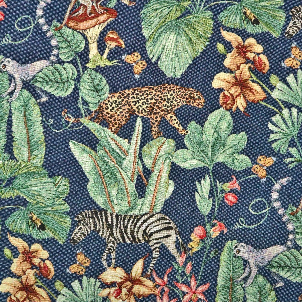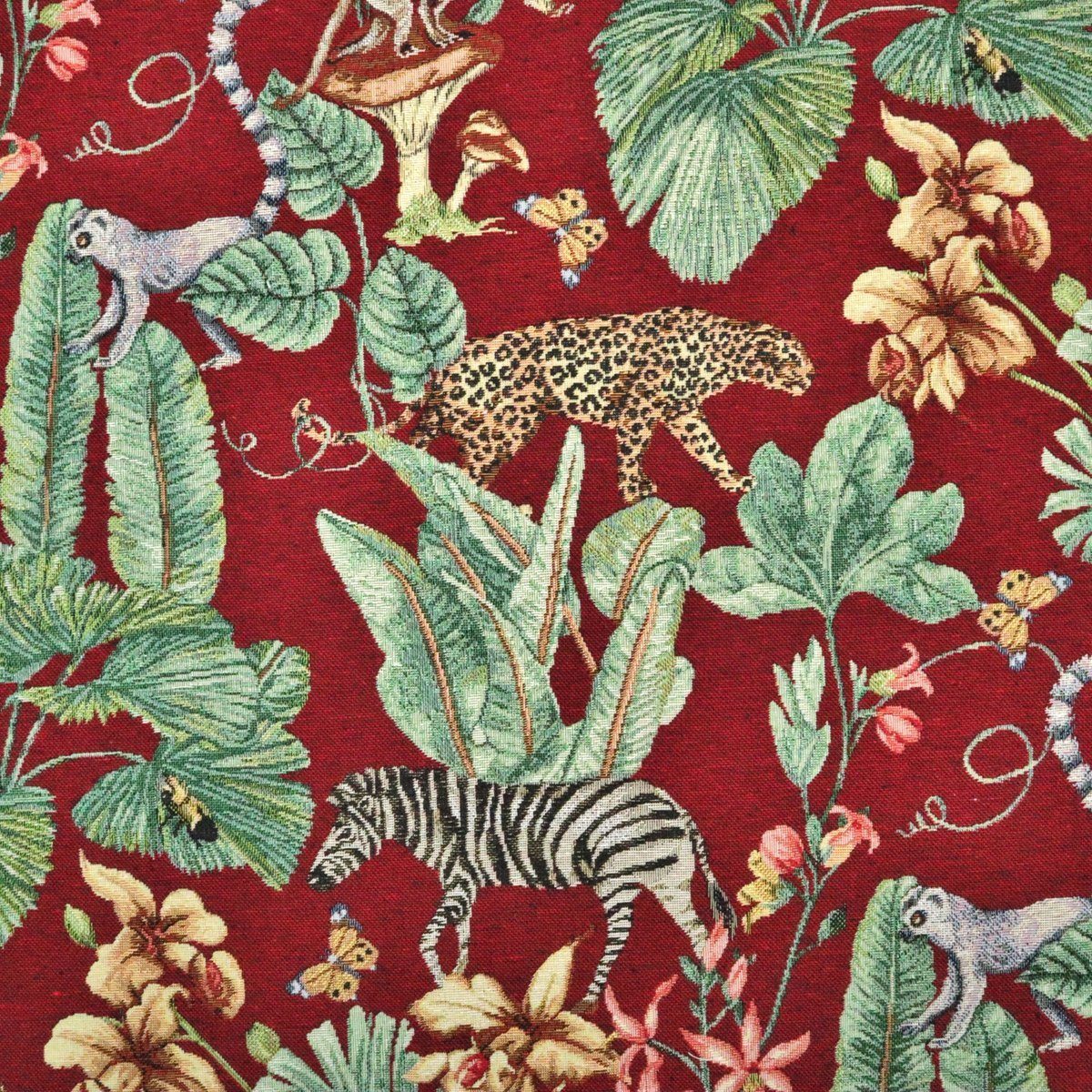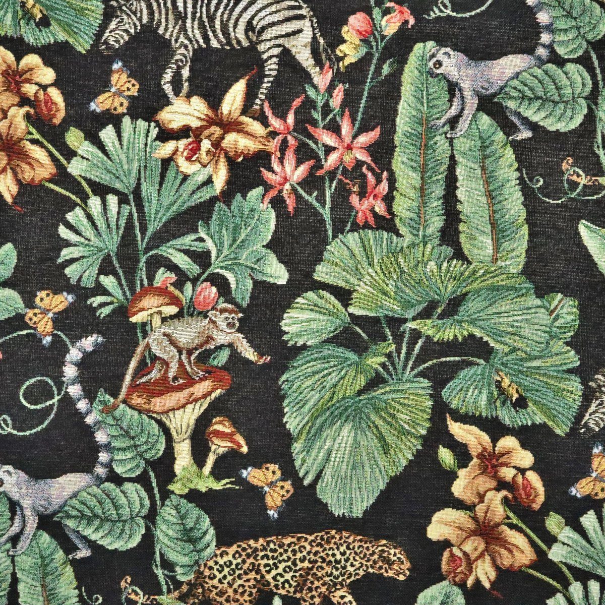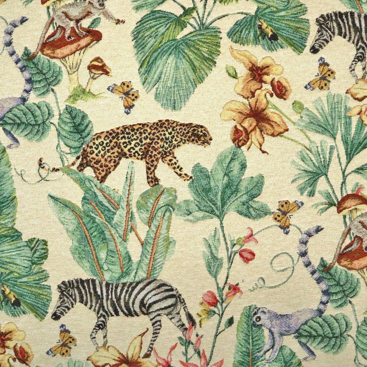 Der Polsterstoff Gobelin Amanita Beige hat eine Breite von 140 cm und beeindruckende Waldmotive mit Amanita Pilzen, Affen, Pflanzen, Tigern, Blüten und Zebras.