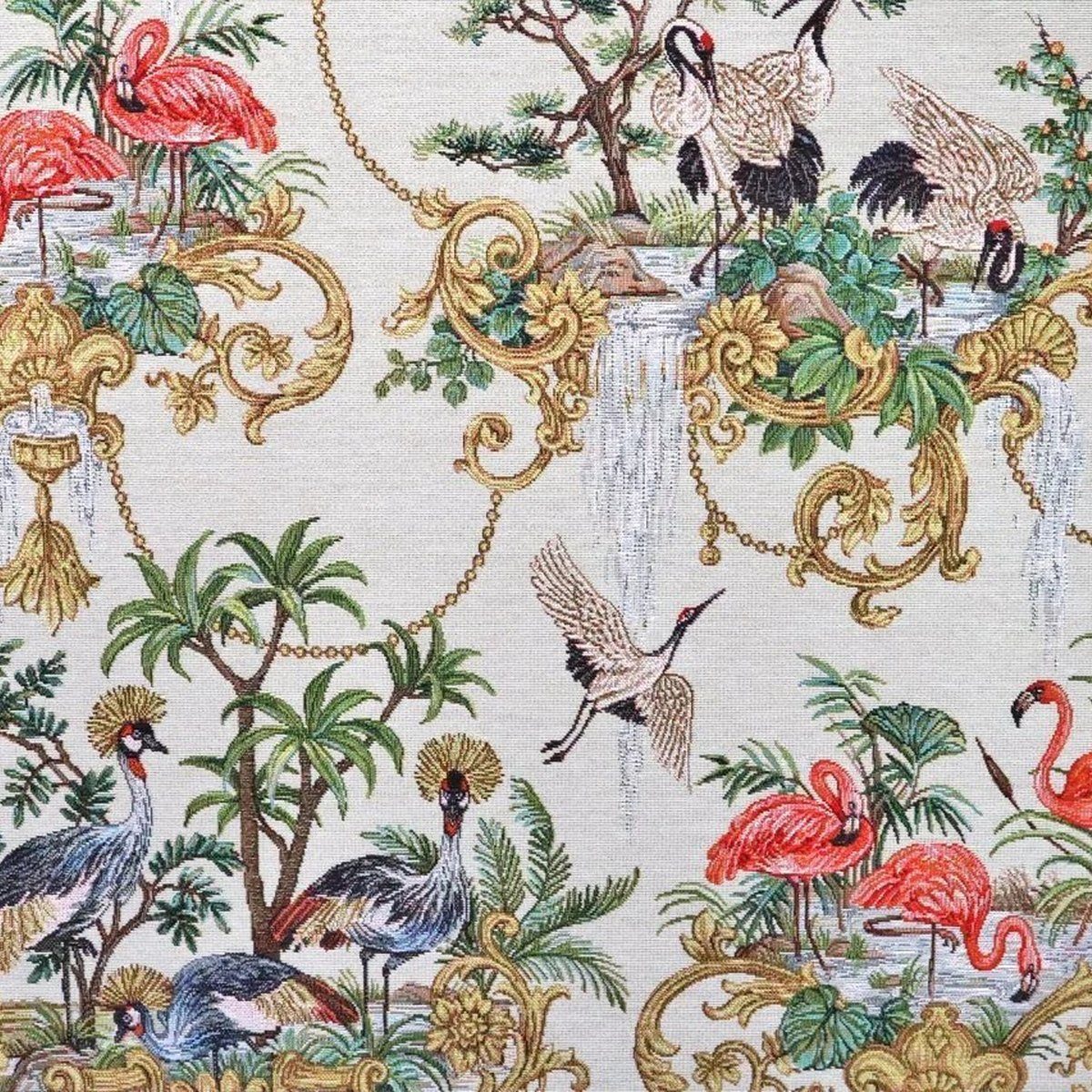 Der Polsterstoff Gobelin Flamingo Luxury Ecru ist ein exklusiver Jacquard Stoff mit einem Breite von 140 cm. Sein aufwendig gewobenes Muster zeigt fliegende Kraniche, Flamingos und goldene Ranken im afrikanischen Tropical-Design. Der Stoff hat eine angenehm glatte Oberfläche und ein fester Gewebegriff. Dank seiner robusten Eigenschaften ist dieser Dekostoff reißfest und formstabil. Er eignet sich daher ideal für eine Vielzahl von Wohnaccessoires wie Kissen, Tagesdecken, Sitzgelegenheiten, Stuhlauflagen, Taschen, Tischdekorationen und Tischläufern. Auch für die Polsterung von Möbeln ist dieser Stoff bestens geeignet. Der Gobelin Flamingo Luxury Ecru ist nicht nur optisch ansprechend, sondern auch ökologisch zertifiziert. Das bedeutet, dass er unter strengen Umweltauflagen hergestellt wurde.