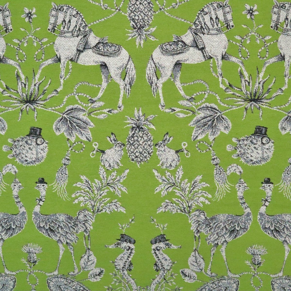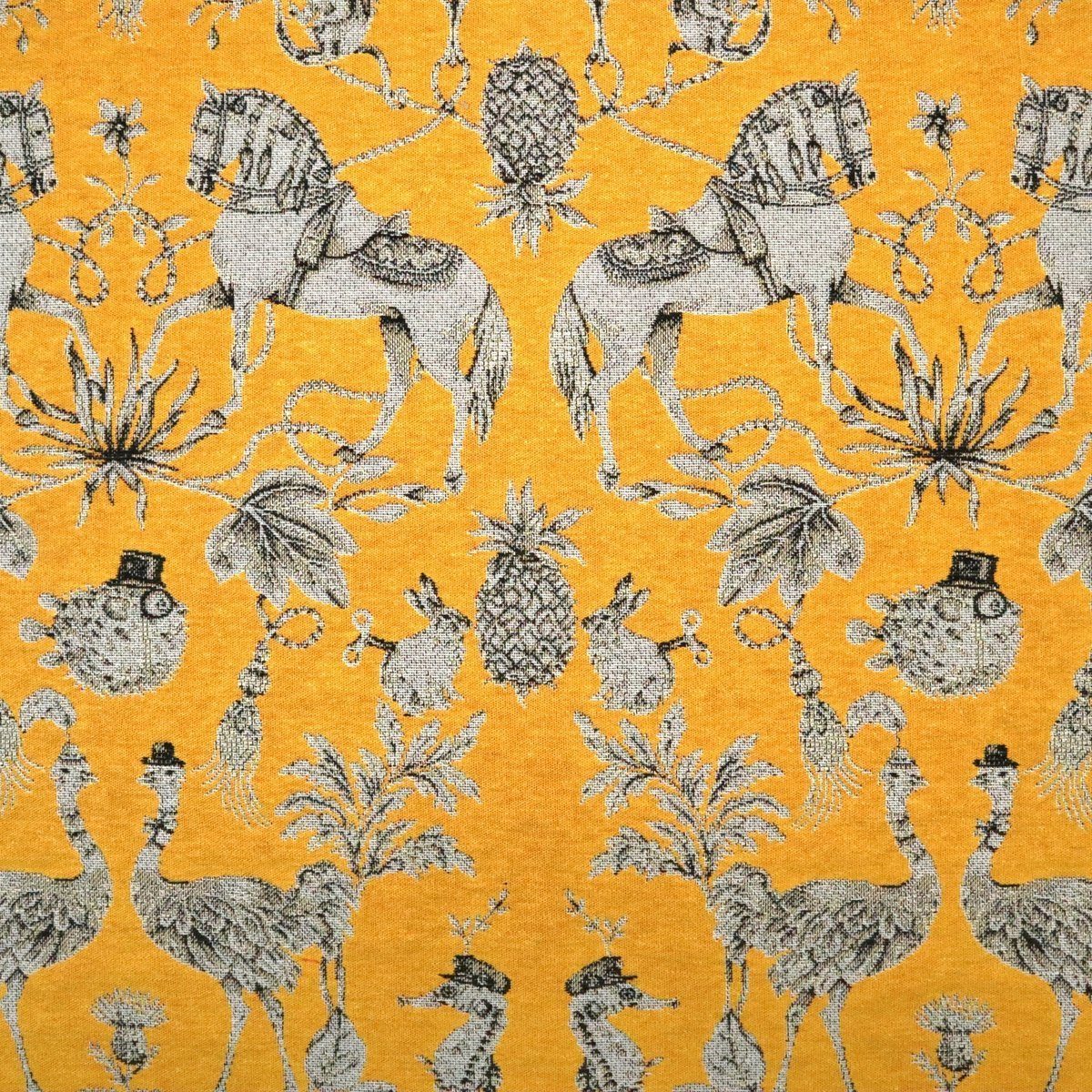 Der Polsterstoff Gobelin Remondini Gelb ist ein hochwertiger Gobelin Jacquard Stoff, der mit seiner leuchtenden Farbgebung und den aufregenden Motiven eine ausgefallene Wirkung erzielt. Mit einer Breite von 140 cm eignet er sich bestens für Polsterungen aller Art. Der Stoff beeindruckt durch eine fantasievolle Zusammenstellung tierischer und floraler Motive, darunter Pferde, Kugelfische, Hasen, Ananasse, Blätter und Vögel. Jeder Blick auf den Stoff enthüllt neue Details, die ihn zu einem faszinierenden Blickfang machen. Dank einer Scheuerbeständigkeit von über 20.000 Einheiten ist der Gobelin Remondini äußerst langlebig und strapazierfähig. Er besteht zu 57% aus Polyester und zu 43% aus Baumwolle, was ihn angenehm weich und gleichzeitig robust macht. Die Reinigung des Stoffs gestaltet sich einfach und unkompliziert. Er kann bei 30 Grad gewaschen, leicht gebügelt und auf niedriger Stufe geschleudert werden. Um die Haltbarkeit zu gewährleisten, empfiehlt es sich, den Stoff nass aufzuhängen und an der Luft trocknen zu lassen. Der Gobelin Remondini vereint also nicht nur ästhetischen Anspruch mit höchster Qualität, sondern bietet auch praktische Vorteile in Bezug auf Reinigung und Pflege. Mit diesem einzigartigen Polsterstoff wird jedes Möbelstück zum Hingucker und verschönert jeden Raum auf ganz besondere Art und Weise.
