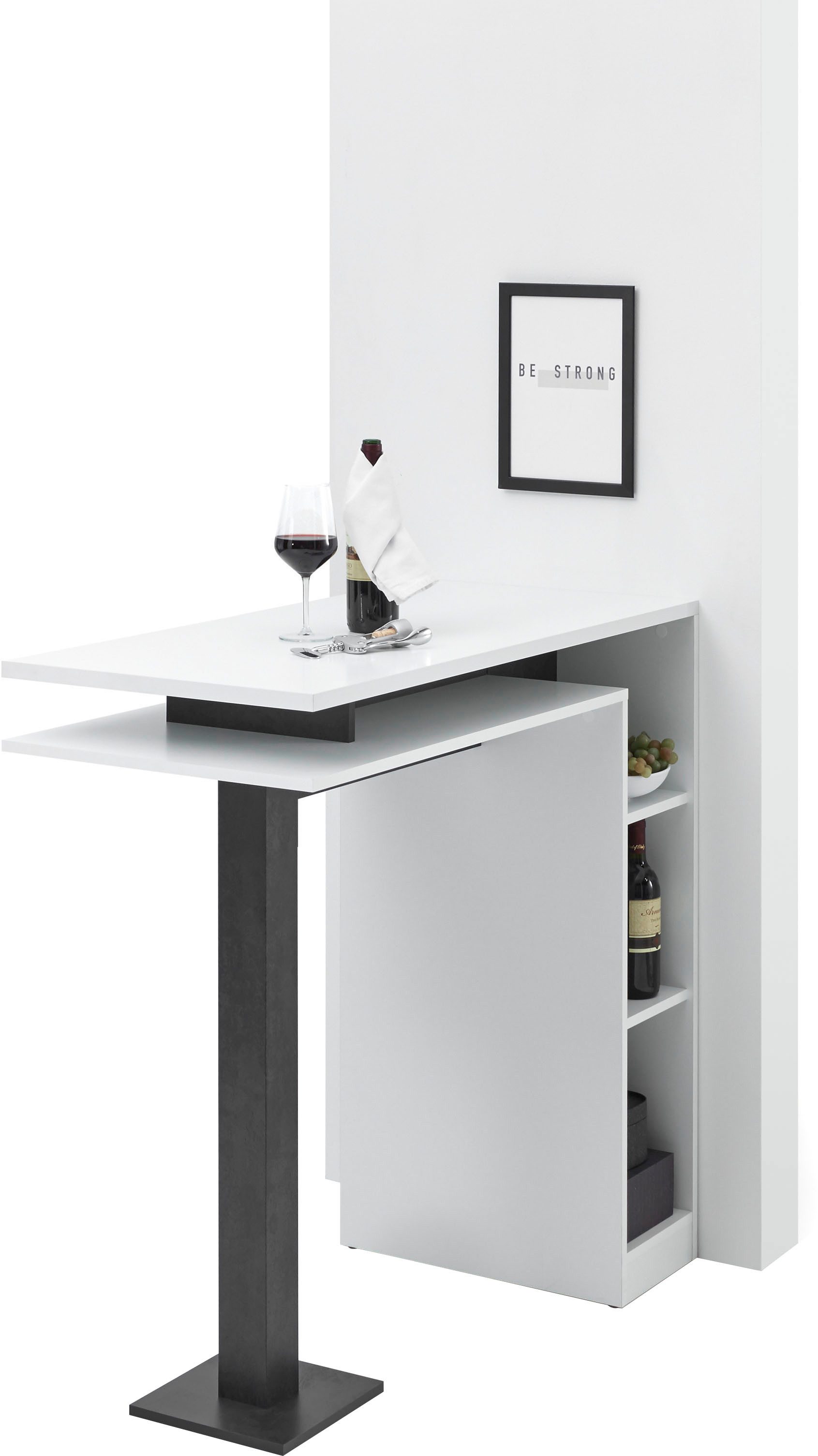 Der Bartisch zeigt sich im modernen Stil und kreiert ein stilvolles Ambiente. Um den trendigen Wohnstil zu unterstreichen und noch gemütlicher zu gestalten, sind zum Beispiel Pastellfarben empfehlenswert. Auch Accessoires wie Glas oder Naturstein passen gut.