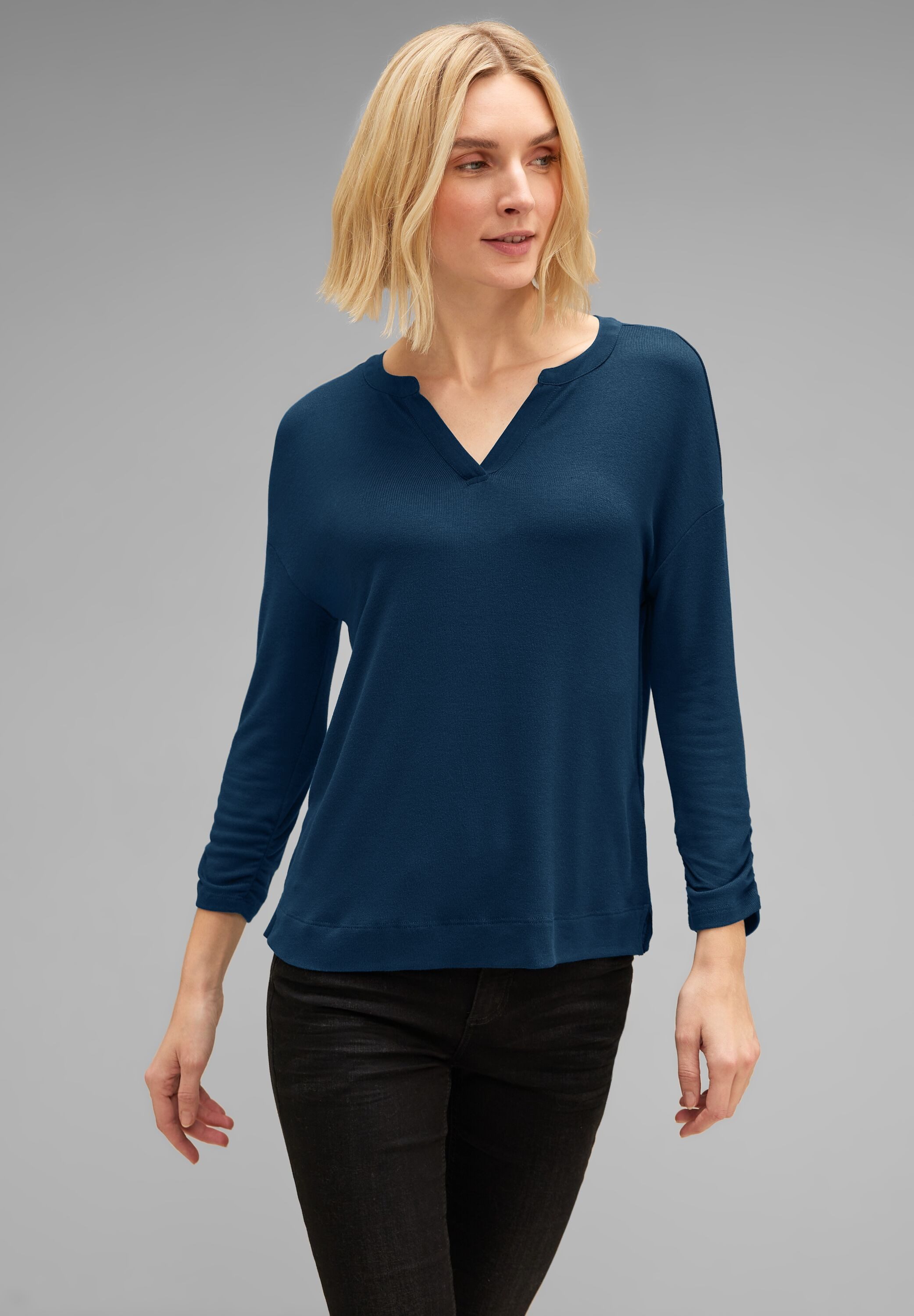 Street One Shirt, geraffte 3/4 Ärmel, geschlitzer Ausschnitt, angenehmer Tragekomfort, wärmender Material Mix. Ein stilvolles Shirt für vielseitige Outfits! Das Street One Shirt mit gerafften 3/4 Ärmeln, geschlitztem Ausschnitt und Materialmix ist eine großartige Ergänzung für deine Garderobe. Dieses Damenshirt zeichnet sich durch seine hinten längere Schnittform aus und bietet einen bequemen Mix aus Jersey und Strick, der für hohen Tragekomfort sorgt. Die gerafften Ärmel und der geschlitzte Ausschnitt verleihen ihm eine besondere Note.