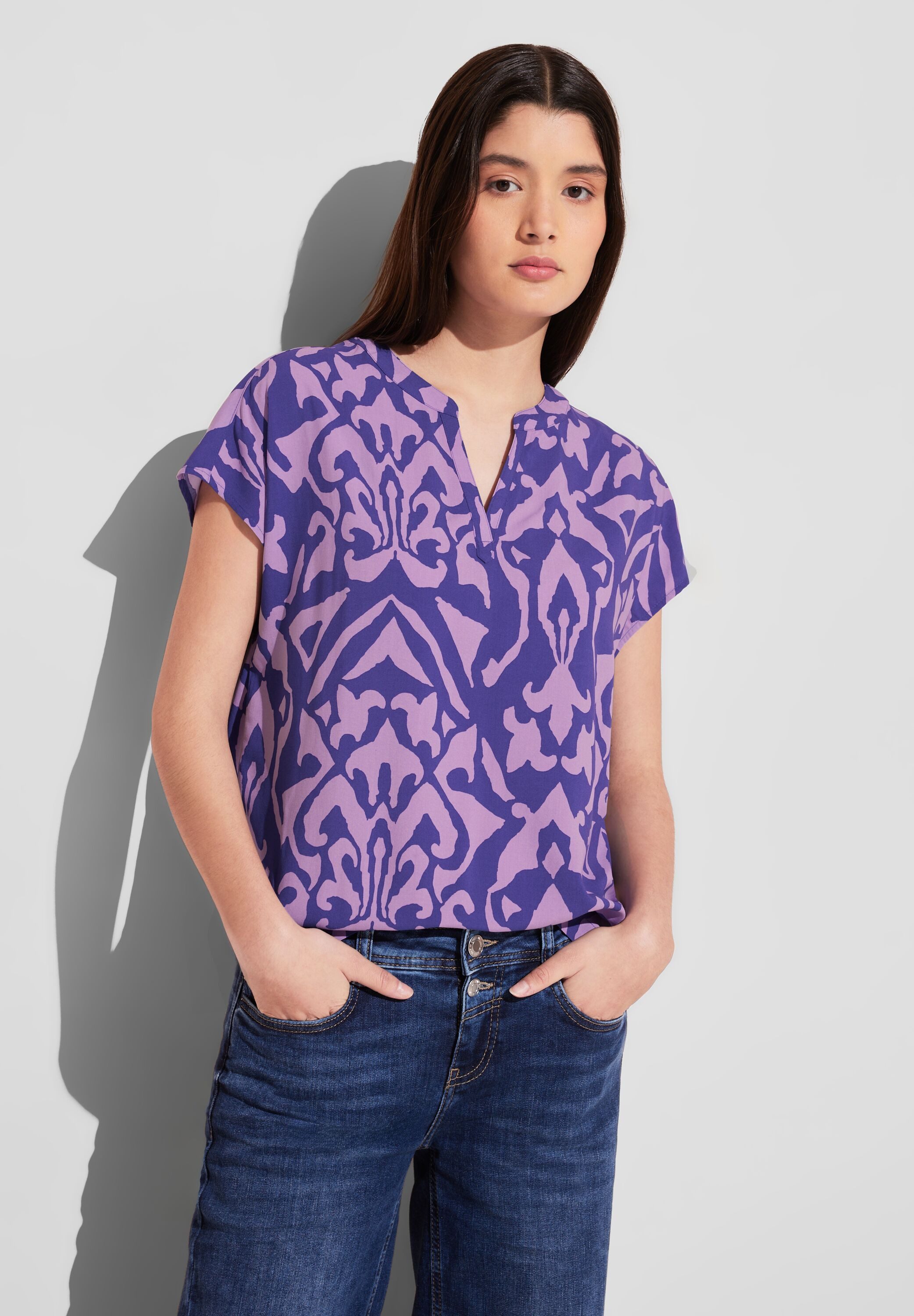 Street One Damen Print Bluse, Blusenshirt, Feminine Raffungen im Rücken, Geschlitzter Rundhals, Grafisches Muster, Softe Viskose. Die Print Bluse von Street One für Damen vereint ein modernes Design mit femininen Details. Mit einem geschlitzten Rundhals und Raffungen im Rückenbereich bietet sie eine elegante Silhouette. Das grafische Muster und das weiche Viskosematerial machen sie zu einem vielseitigen Kleidungsstück für jeden Anlass.