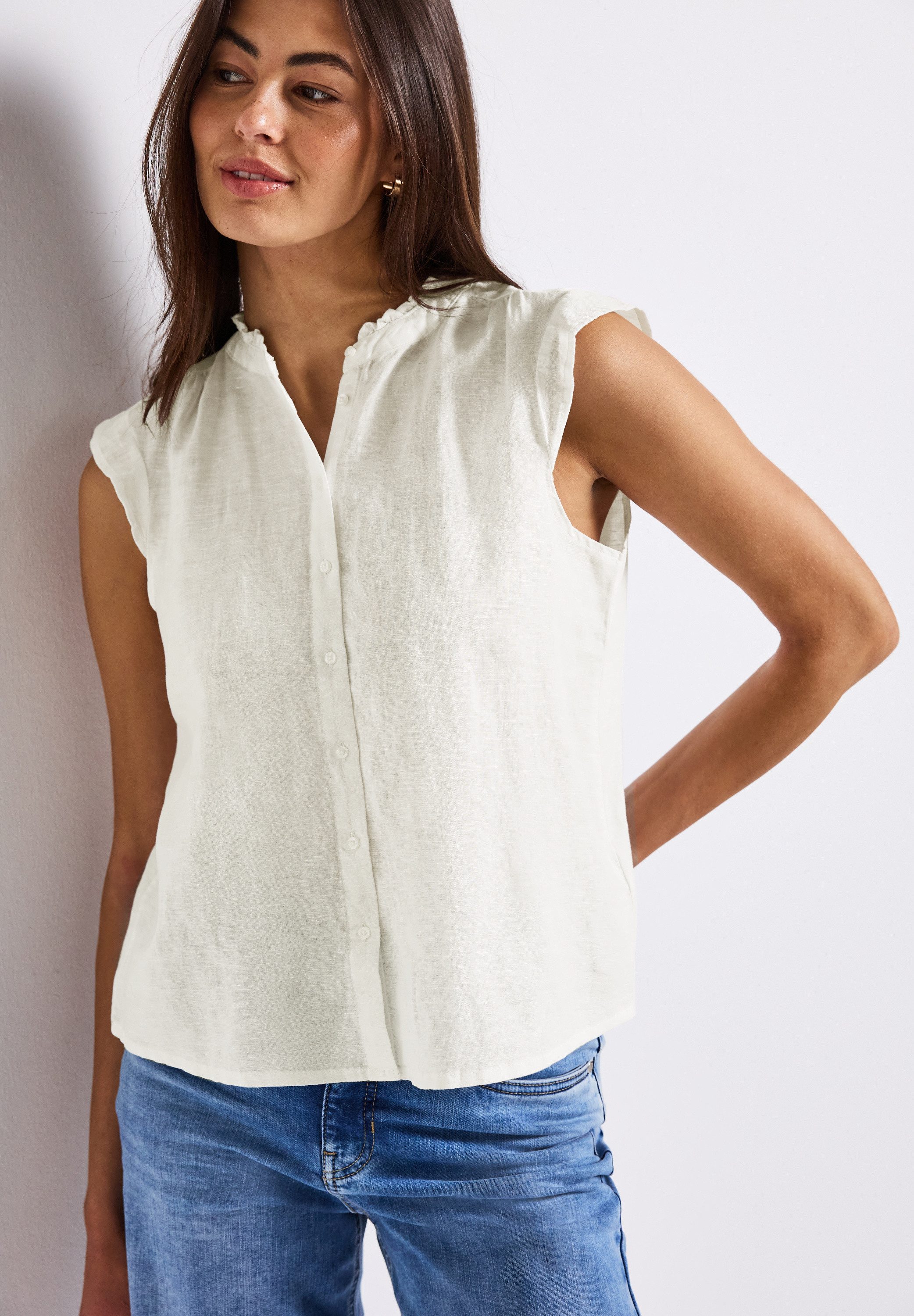 Die Hemdbluse von STREET ONE ist bei festlichen Veranstaltungen oder im Büro eine stilsichere Wahl. Durch die Rüschen wirkt sie zauberhaft und trendy. Der Stehkragen steht, wie der Name bereits verrät, gerade nach oben ohne umgeschlagen zu werden. Dadurch eignet er sich vor allem für schicke und toughe Outfits. enden in einem Rüschenabschluss. Die ärmellose Bluse ist die elegantere Alternative zum Trägertop. An heißen Tagen betont sie gekonnt deine Oberarme. Diese Bluse hat einen Rundhalsausschnitt mit Knopfleiste und ist hüftbedeckend sowie gerade geschnitten und umspielt deinen Oberkörper locker.