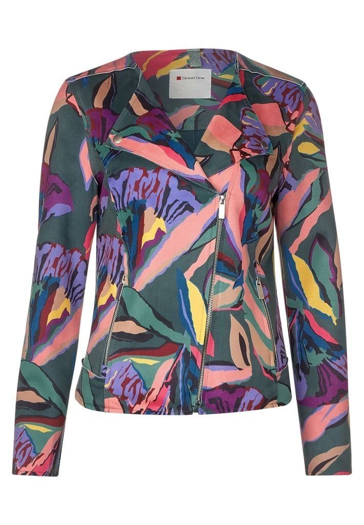 Tropical Vibes: Die Kunstlederjacke aus samtigen Velours fällt mit seinem bunten, tropischen Muster sofort auf! Mit asymmetrischem Reißverschluss, Taschen mit Reißverschluss und coolen Nähten entsteht der rockige Biker-Style. Das Material ist elastisch und macht somit jede Bewegung mit.