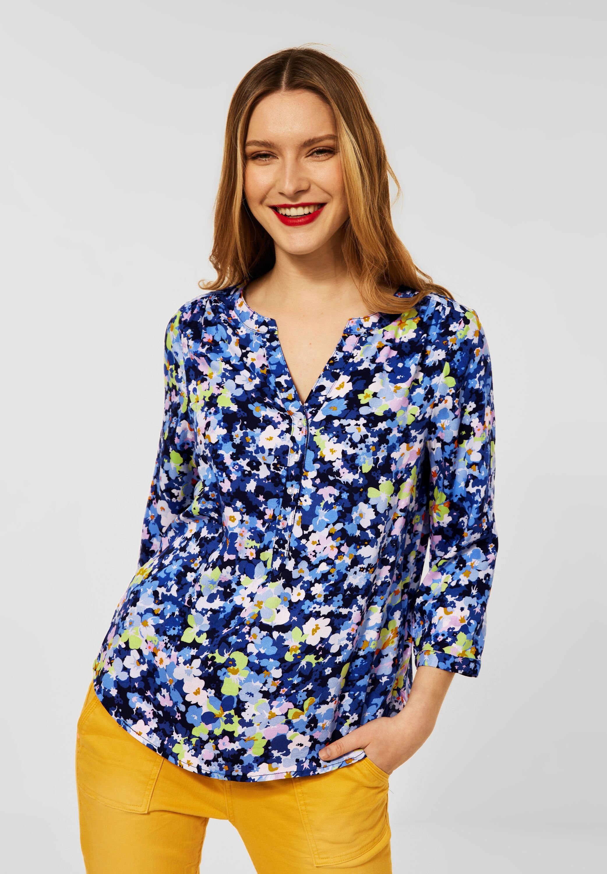 Verliebt sein macht immer Spaß. Erst recht, wenn diese feminine Bluse von Street One zu Ihrem modischen Repertoire gehört. Der feminine Style wird unterstrichen durch einen geschlitzten, eleganten Rundhalsausschnitt. Interessant zeigt sich auch der 3/4 lange Arm der den femininen Style der Damenbluse unterstreicht. So kommt echte Freude an einem Modell auf, das sich vielseitig kombinieren lässt und immer auch mit der leger sitzenden Passform punktet. Interessant bleibt dabei immer der großzügige Blumenprint. Für das volle Maß an Bequemlichkeit sorgt die hautsympathisch zu tragende Viskose.