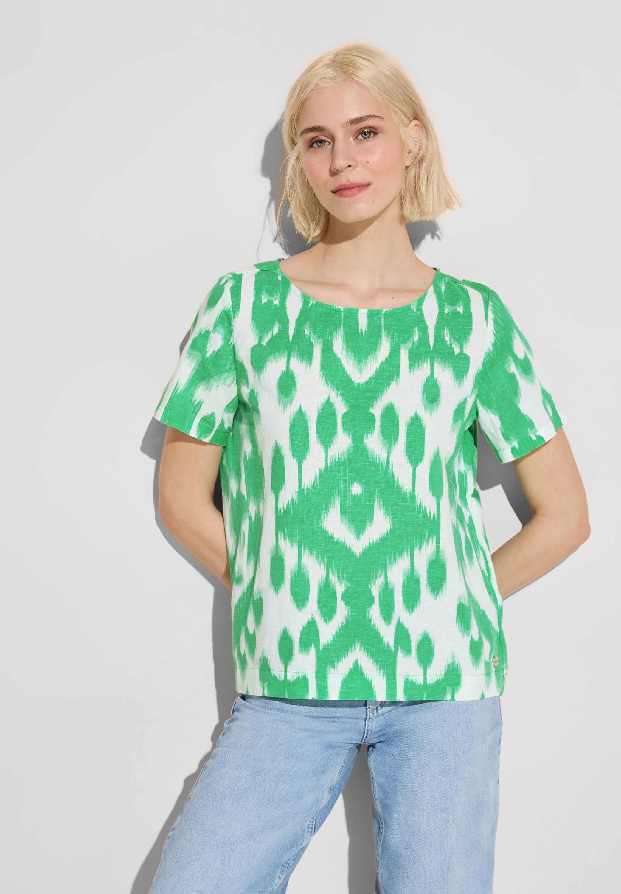 Street One Sommer Bluse mit Print, Rundhalsausschnitt mit Schlitz im Nacken, Schlitze im dekorativen Saum, Leinen-Baumwollmischung, grafisches Muster. Die Sommerbluse mit Print von Street One für Damen ist ein trendiges Blusenshirt mit einem femininen Rundhalsausschnitt, der mit einem Schlitz im Nacken verziert ist. Die Schlitze im dekorativen Saum verleihen dieser Bluse einen modernen Touch und sorgen für eine luftige Passform. Hergestellt aus einer hochwertigen Leinen-Baumwollmischung und mit einem grafischen Muster versehen, bietet diese Bluse optimalen Tragekomfort und verleiht deinem Look eine stilvolle Note.