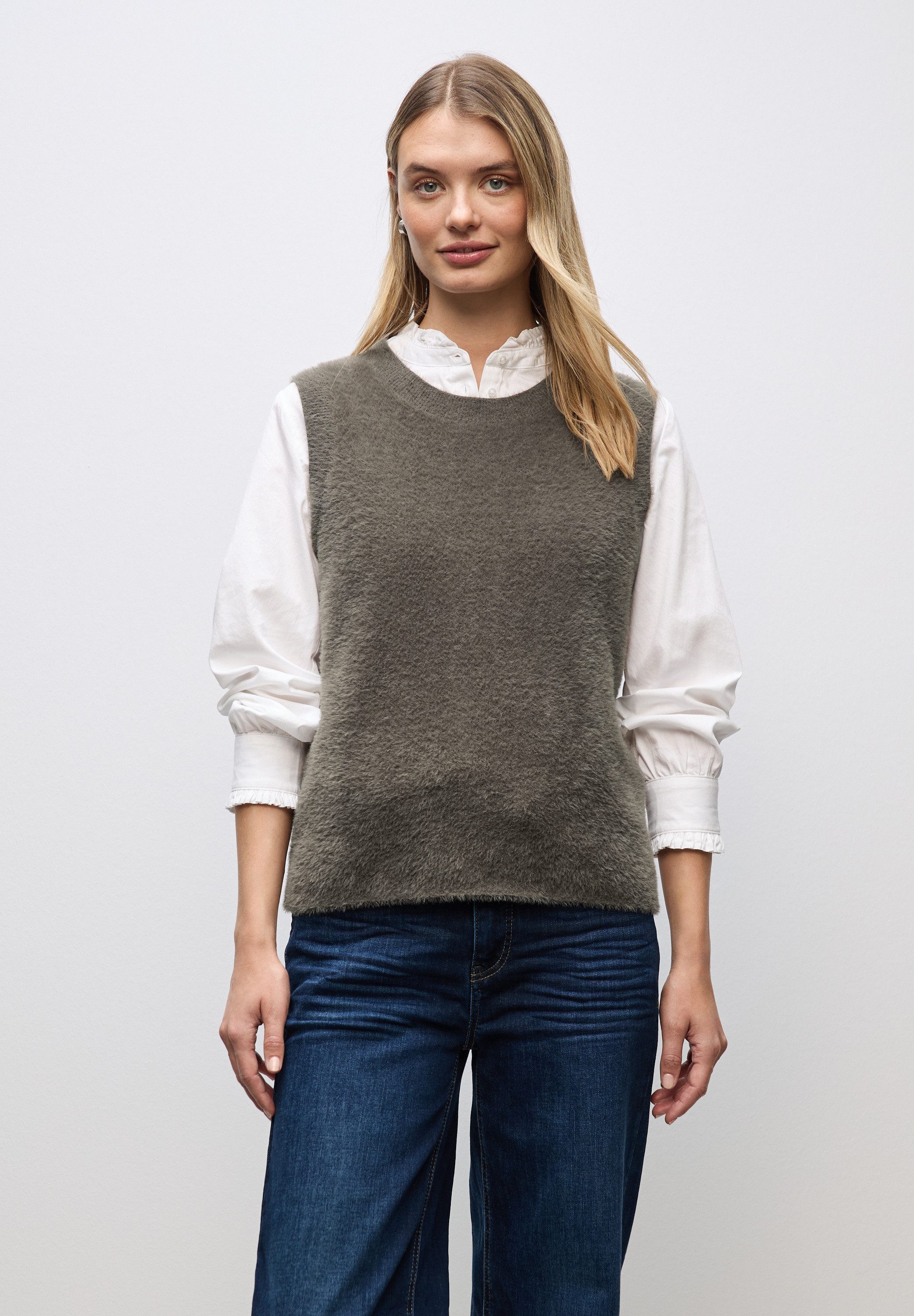 Der Pullunder von STREET ONE ist nicht nur an kalten Tagen eine praktische Wahl, sondern auch ein Feel-good-Oberteil für zu Hause. Dieser Pullover hat einen Rundhalsausschnitt und ist hüftlang sowie basic geschnitten und umspielt deinen Oberkörper locker.