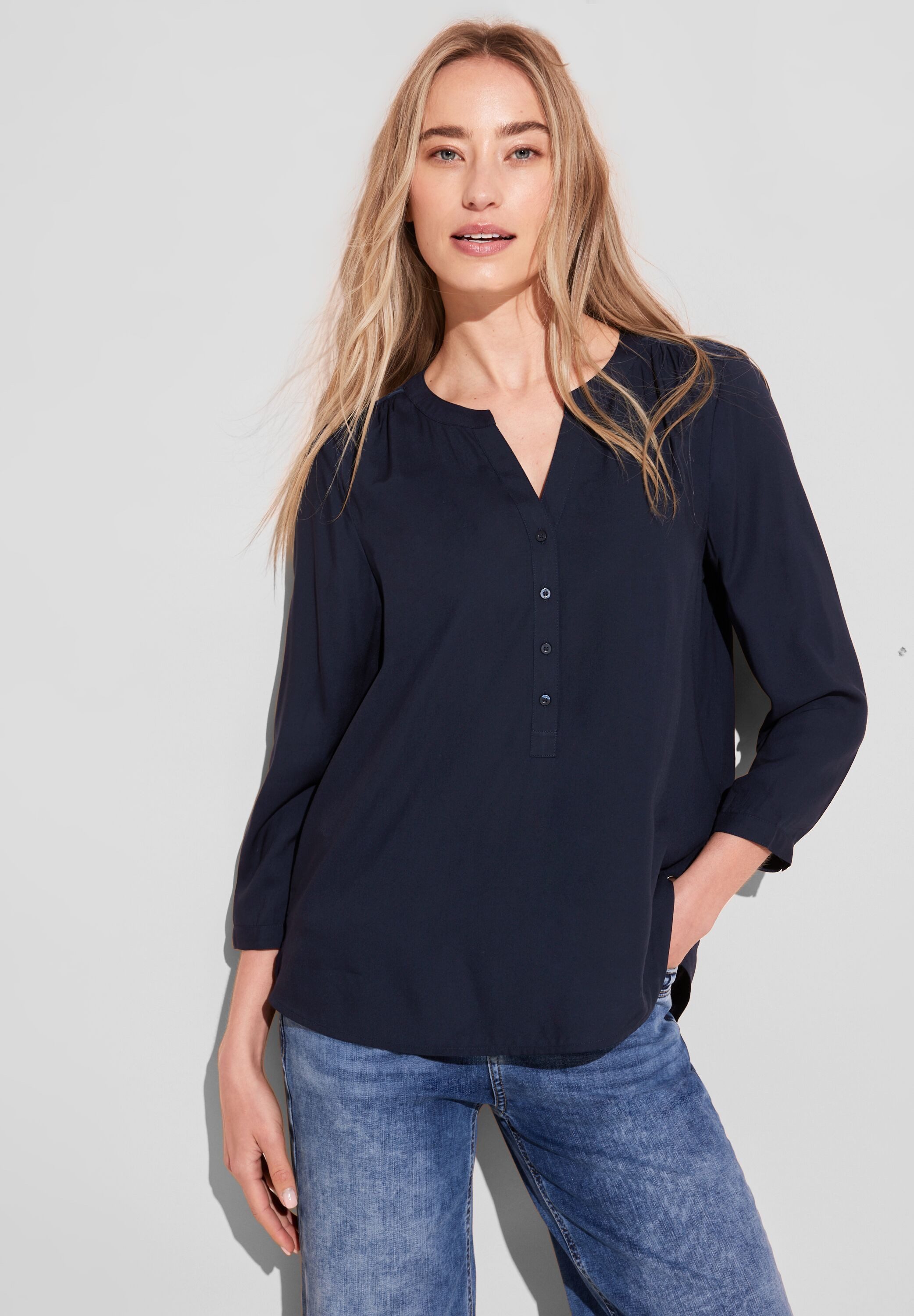 Street One Damen Viskose Bluse, 3/4 Arm mit Knopf, geschlitzter Ausschnitt mit Knopfleiste, Spitzeneinsatz, abgerundeter Saum. Die Viskose Bluse im Style Bamika von Street One für Damen präsentiert sich als elegante Spitzenbluse. Mit einem 3/4-Arm versehen, der mit einem Knopf akzentuiert ist, bietet sie einen geschlitzten Rundhalsausschnitt mit Knopfleiste für eine raffinierte Optik. Ein Spitzeneinsatz verleiht der Bluse zusätzlichen Charme, während der abgerundete Saum den Look perfektioniert.