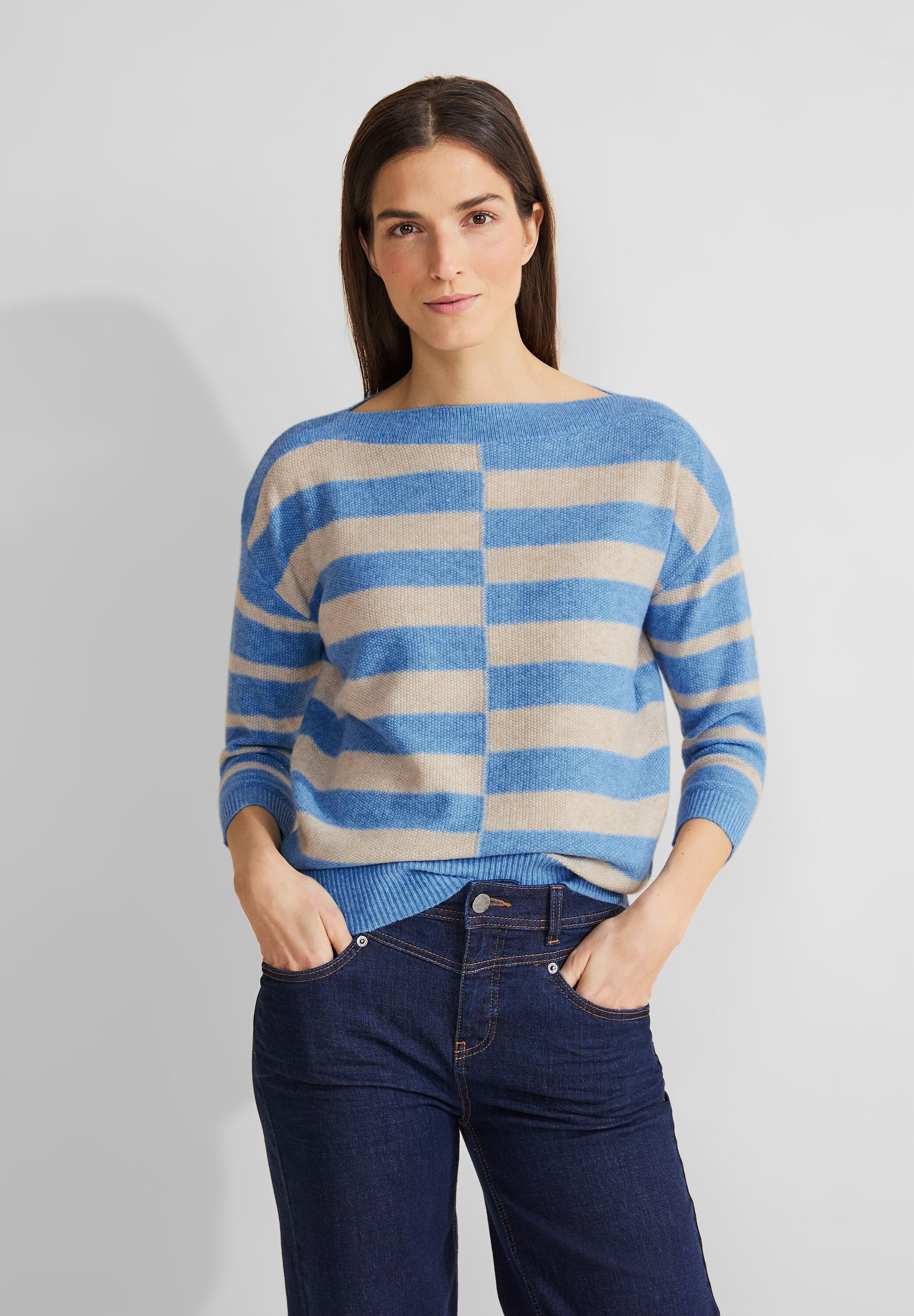 Street One Damenpullover, versetztes Streifenmuster, U-Boot Ausschnitt, 3/4 Arm. Der Damenpullover von Street One ist ein echtes Highlight für deine Garderobe. Mit seinem versetzten Streifenmuster und dem U-Boot Ausschnitt hat er eine moderne und zugleich zeitlose Optik. Die Rippbündchen verleihen dem Pullover eine sportliche Note, während der bequeme Materialmix für hohen Tragekomfort sorgt. Dieser Strickpullover mit 3/4 Arm im Grobstrick ist vielseitig kombinierbar und ein perfekter Begleiter für modische Outfits.