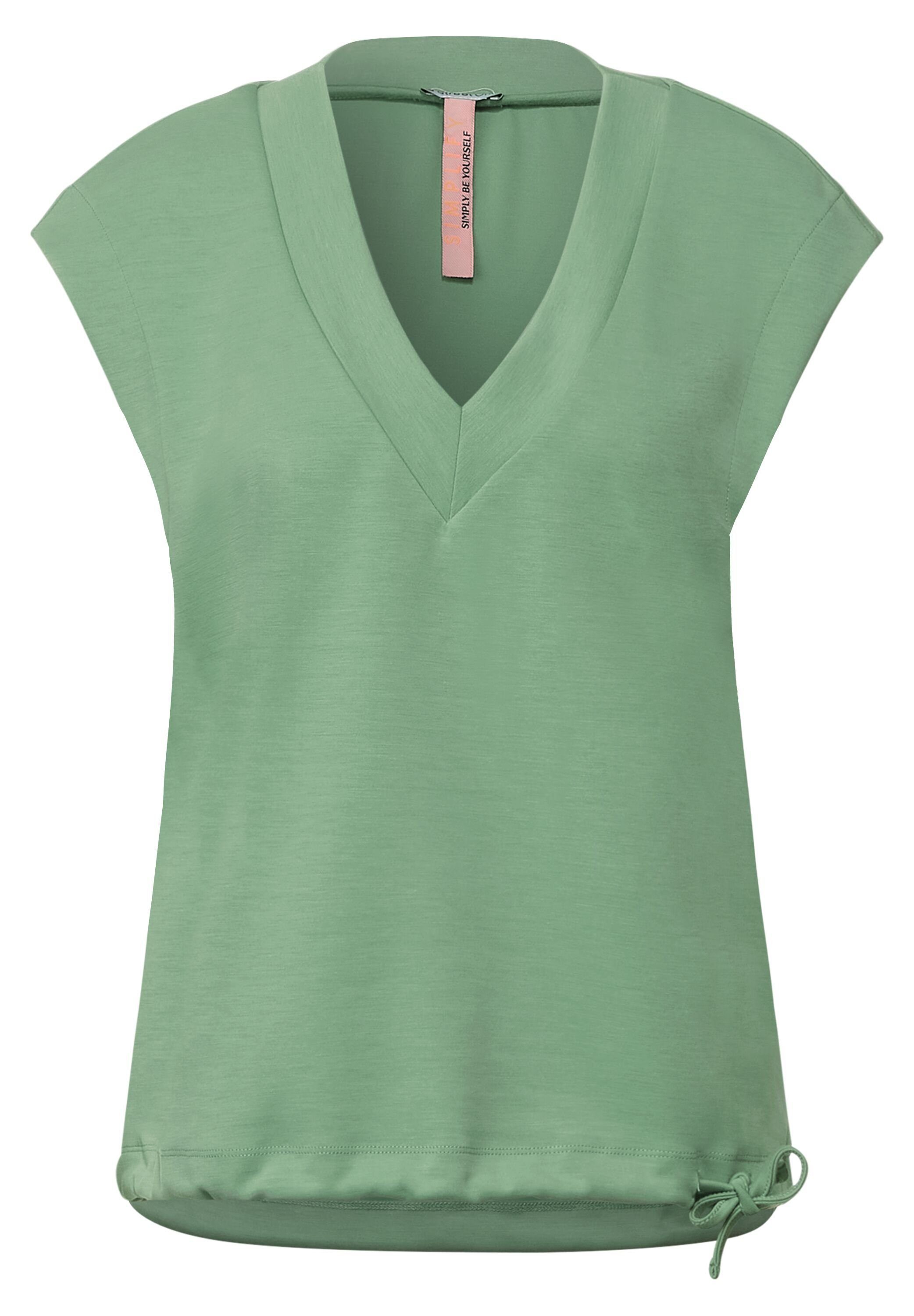 Feel good! Leichter Damenpullunder von Street One im Layer Style. Der Seiden Look sieht nicht nur zart und feminin aus, sondern trägt sich auch besonders angenehm. V-Ausschnitt und Tunnelzugband im Saum setzen sportliche Akzente.