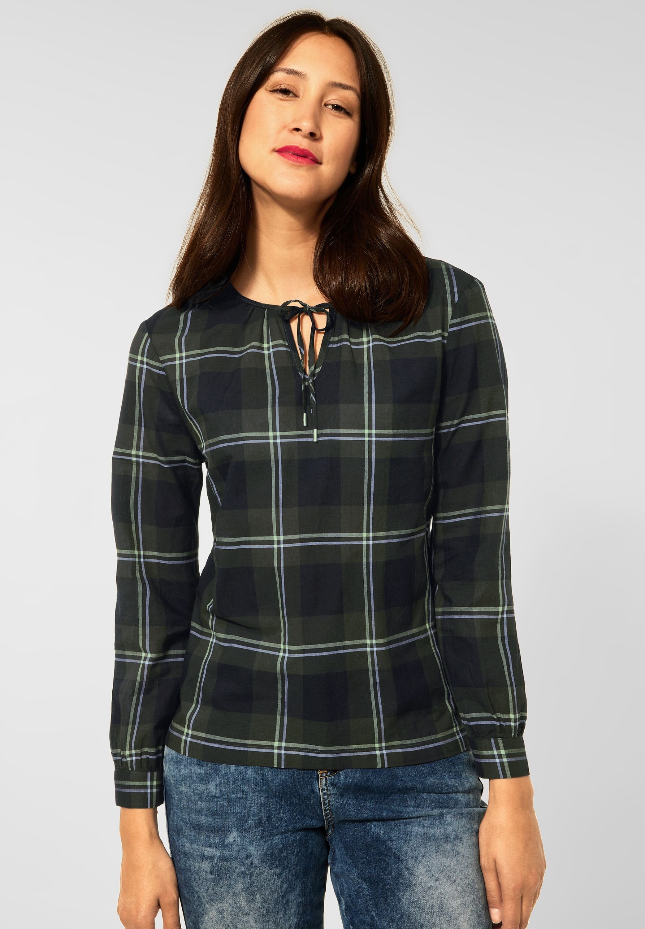 Ideal für einen sportiven Auftritt mit junger Damenmode für die schönen Herbsttage ist diese Bluse von Street One. Für den gelungenen Auftritt an regnerischen Tagen steht der geschlitzte, elegante Ausschnitt. Dazu kommt der lange Arm, der für den ganzen Komfort der Damenbluse steht. Die Basicstyle Bluse besticht mit einem locker geschnittenen Tunika-Style. Das Karo Design ist die perfekte Art, herbstliche Outfits zur Schau zu tragen. Hergestellt wird das Modell aus einem soften Baumwollmaterial, das auch für die strapazierfähigen Eigenschaften der Damenbluse steht.