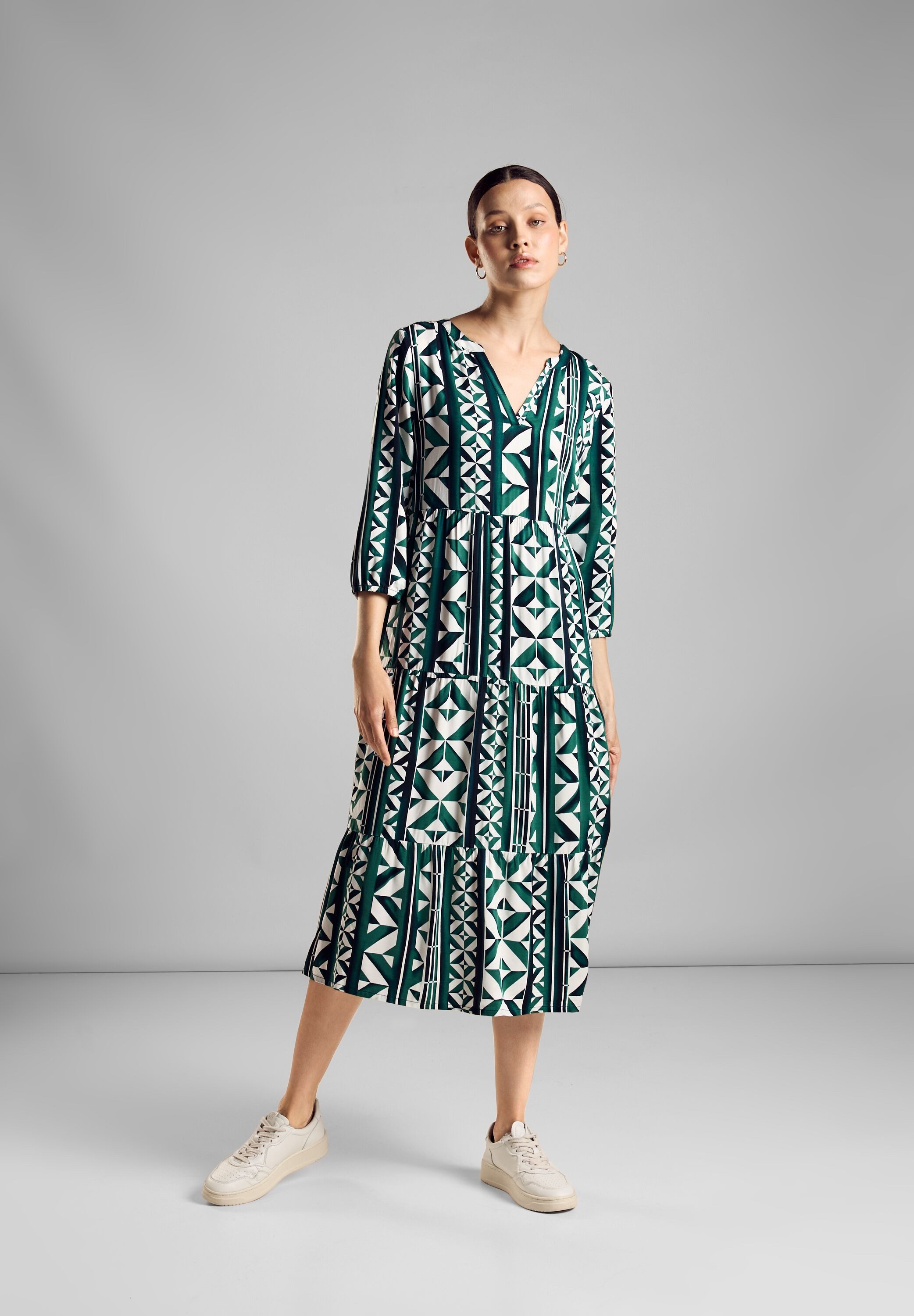 Street One Damen Midikleid mit Print, Tunika Kleid, geschlitzter Rundhals, 3/4 Arm mit Bündchen, luftig leichte Volants, softe Viskose-Qualität. Das Midikleid mit Zick Zack Print von Street One für Damen präsentiert sich als vielseitiges Must-have für die warme Jahreszeit. Das Tunika-Kleid mit geschlitztem Rundhals und 3/4-Arm mit Bündchen vereint Komfort und Stil auf elegante Weise. Die luftig leichten Volants und die weiche Viskose-Qualität garantieren einen modischen Auftritt und ein angenehmes Tragegefühl bei jedem Anlass.