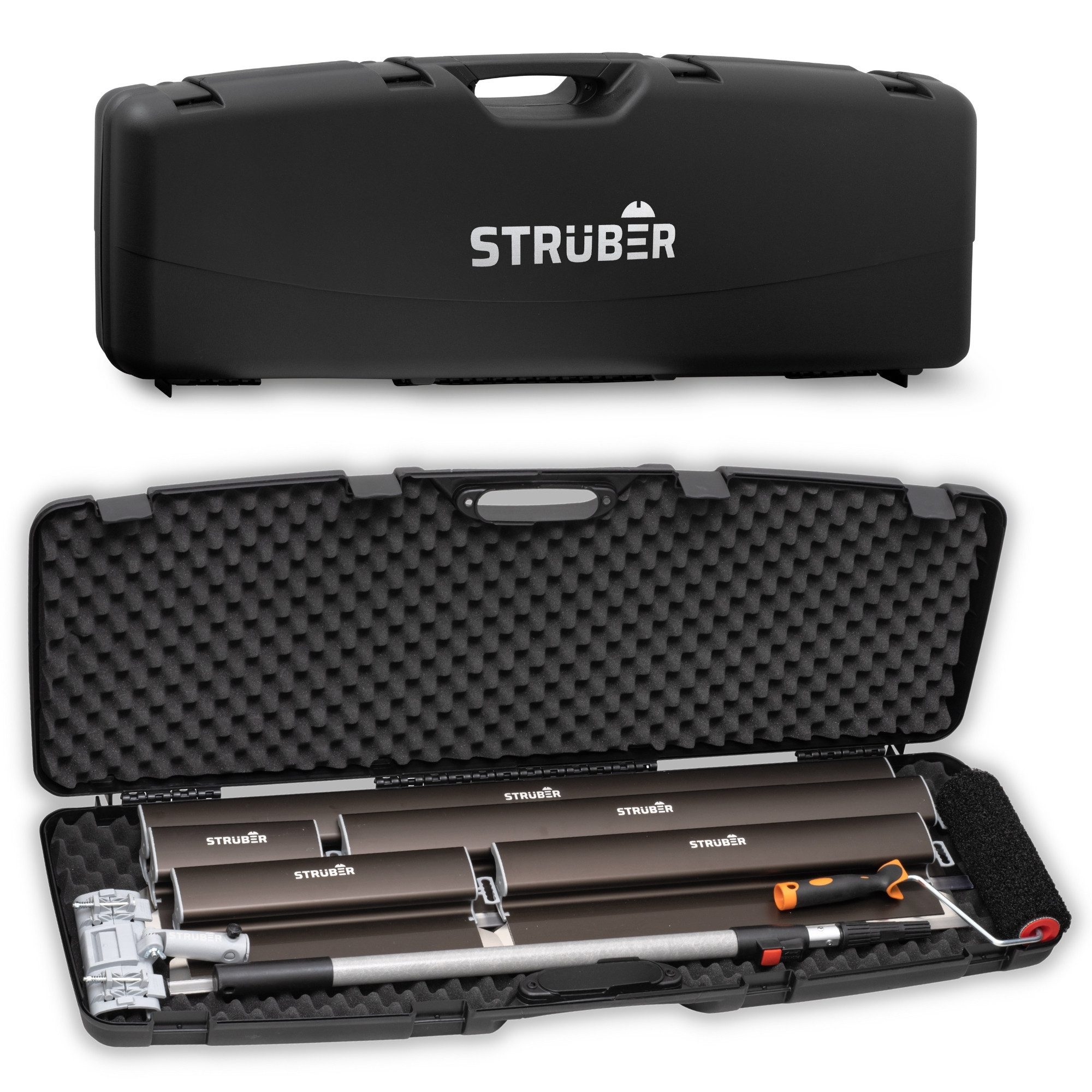 Das STRÜBER Set bietet Ihnen alles, was Sie für hochwertige und effiziente Spachtelarbeiten benötigen. Enthalten sind fünf flexible Flächenspachtel in Größen von 250 mm bis 1000 mm, die sich ideal für großflächiges Glätten eignen. Die Edelstahlklingen mit einer Stärke von 0,3 mm und abgerundeten Ecken ermöglichen ansatzfreies Arbeiten. Der rutschfeste Aluminiumgriff sorgt für präzise Kontrolle und Komfort. Ersatzklingen sind separat erhältlich. Der im Set enthaltene Rollspachtel mit 25 cm Breite ist aus langlebigen Nylonfasern gefertigt und gewährleistet ein schnelles, gleichmäßiges Auftragen von Spachtelmasse. Er eignet sich auch für das Verfugen von Gipsplatten. Der robuste Transportkoffer bietet eine sichere Aufbewahrung der Werkzeuge. Die hochwertige Kunststoffkonstruktion und die innere Schutzpolsterung schützen vor Beschädigungen. Dank der Teleskopstange und Stielaufnahme erreichen Sie mühelos schwer zugängliche Stellen, ohne ständig eine Leiter benutzen zu müssen. Das Set ist für Heimwerker wie Profis gleichermaßen geeignet und garantiert eine lange Lebensdauer sowie maximale Effizienz bei Ihren Projekten. Technische Details: Spachtelgrößen: 250 mm, 400 mm, 600 mm, 800 mm und 1000 mm / Rollspachtelbreite: 25 cm / Koffermaße: 1200 x 340 x 140 mm / Materialien: Edelstahlklingen, Aluminiumgriffe, Kunststoffkoffer / Hergestellt in def EU.