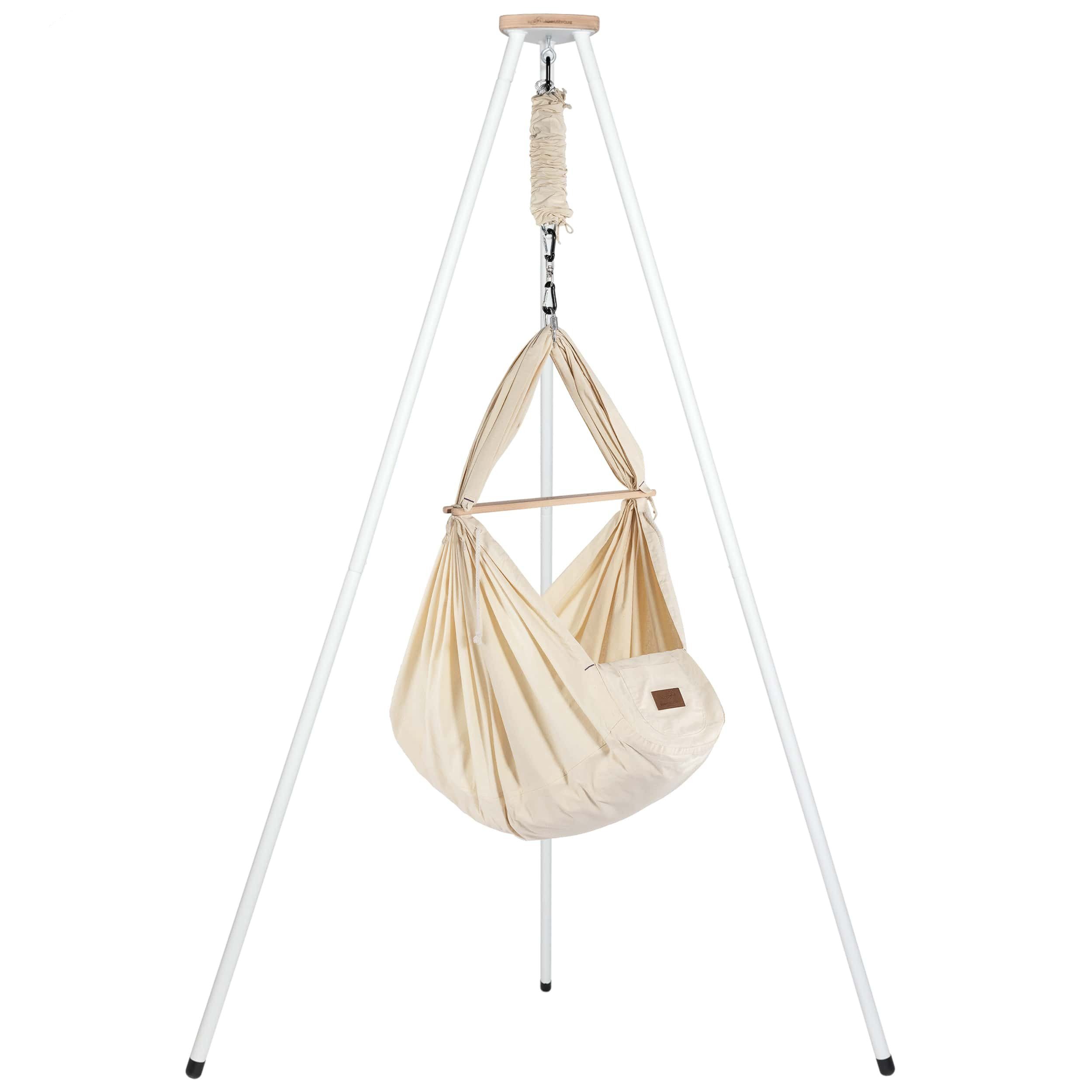 Das Federwiegen-Gestell TIPI ist schnell und unkompliziert aufgebaut und zugleich sehr standfest und stabil. Bei Bedarf bietet es auch ausreichend Platz für die zusätzliche Befestigung unseres SCHMUSEWOLKE-Federwiegenmotors.