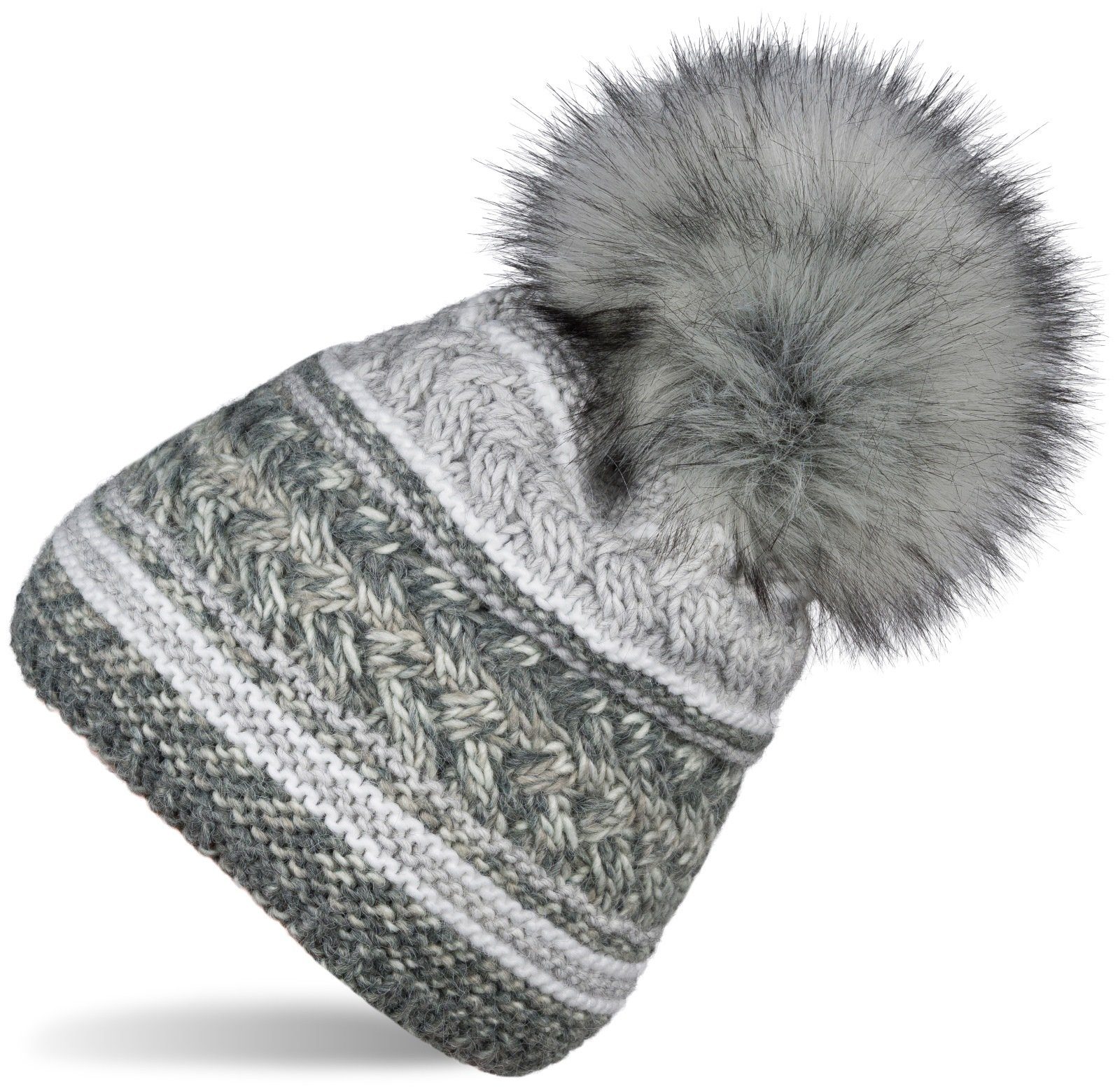 styleBREAKER warme Kunstfell Bommel Strickmütze mit mehrfarbigem Strickmuster Mix, Thermo-Fleece Futter und Fake-Fur Bommel.