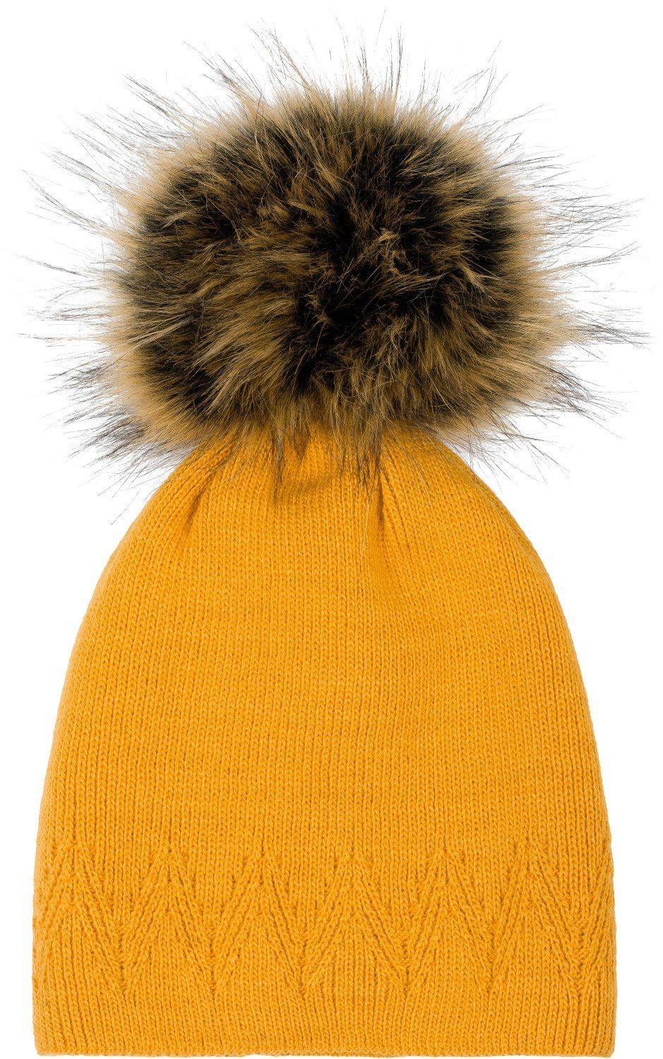 styleBREAKER warme einfarbige Kunstfell Bommel Strickmütze mit Zacken Muster am Bund und abnehmbarem Fake-Fur Bommel.