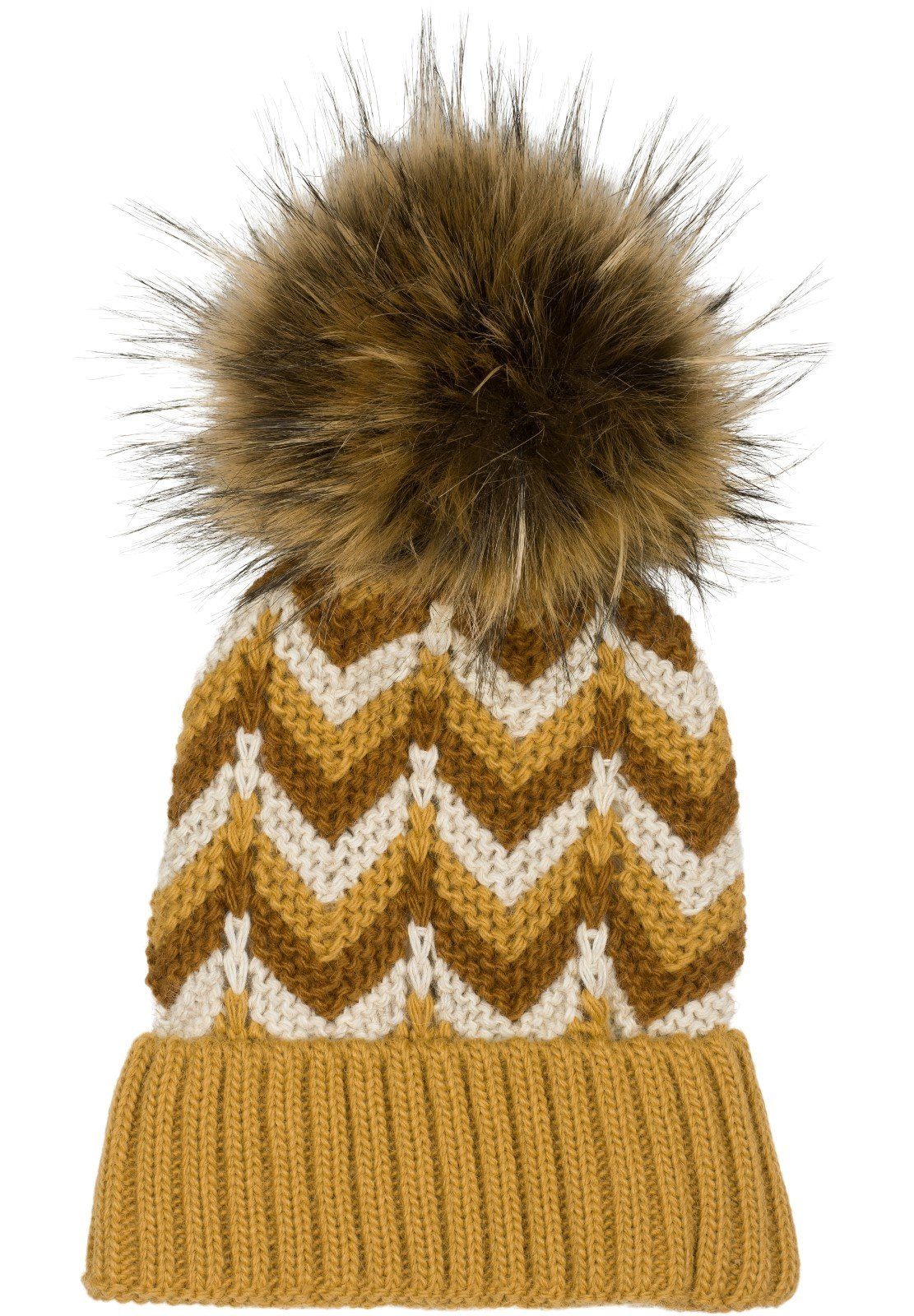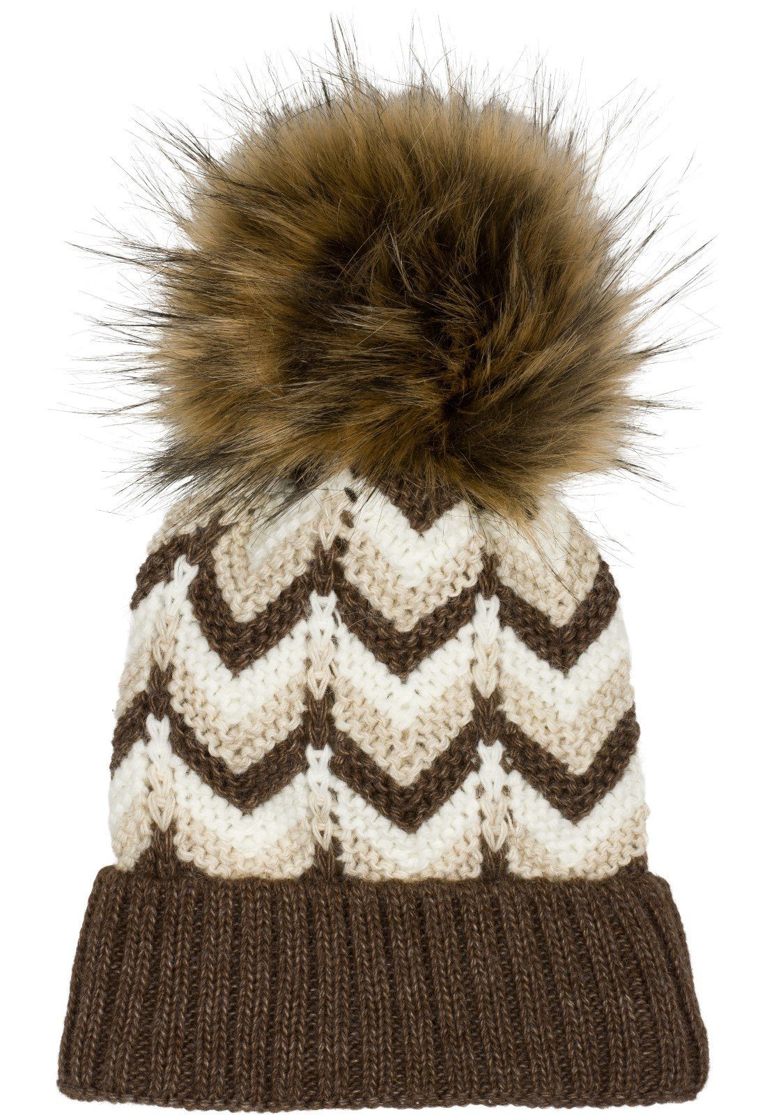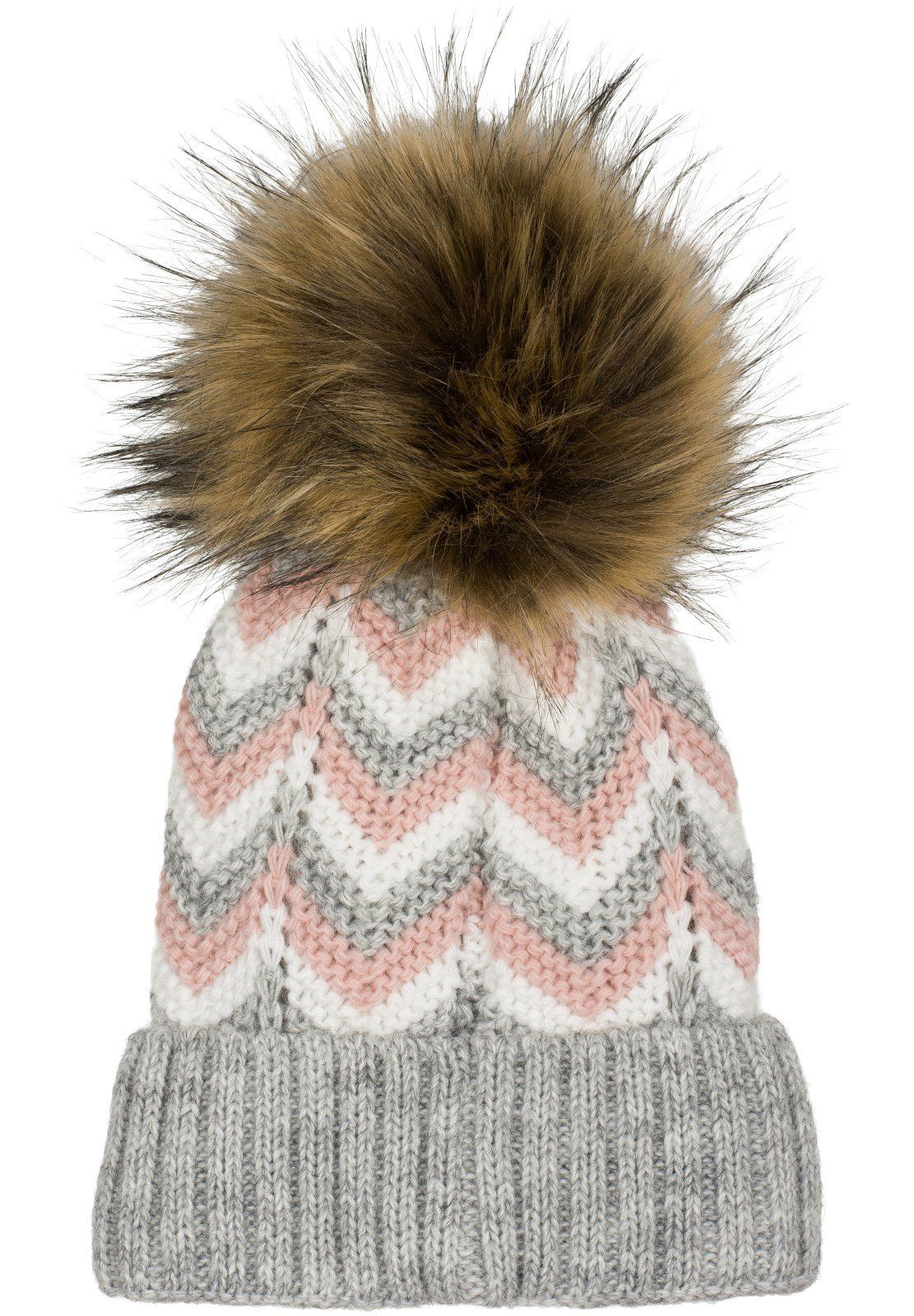 styleBREAKER warme Kunstfell Bommel Strickmütze mit farbigem Zick-Zack Muster, Thermo-Fleece Futter und Fake-Fur Bommel.