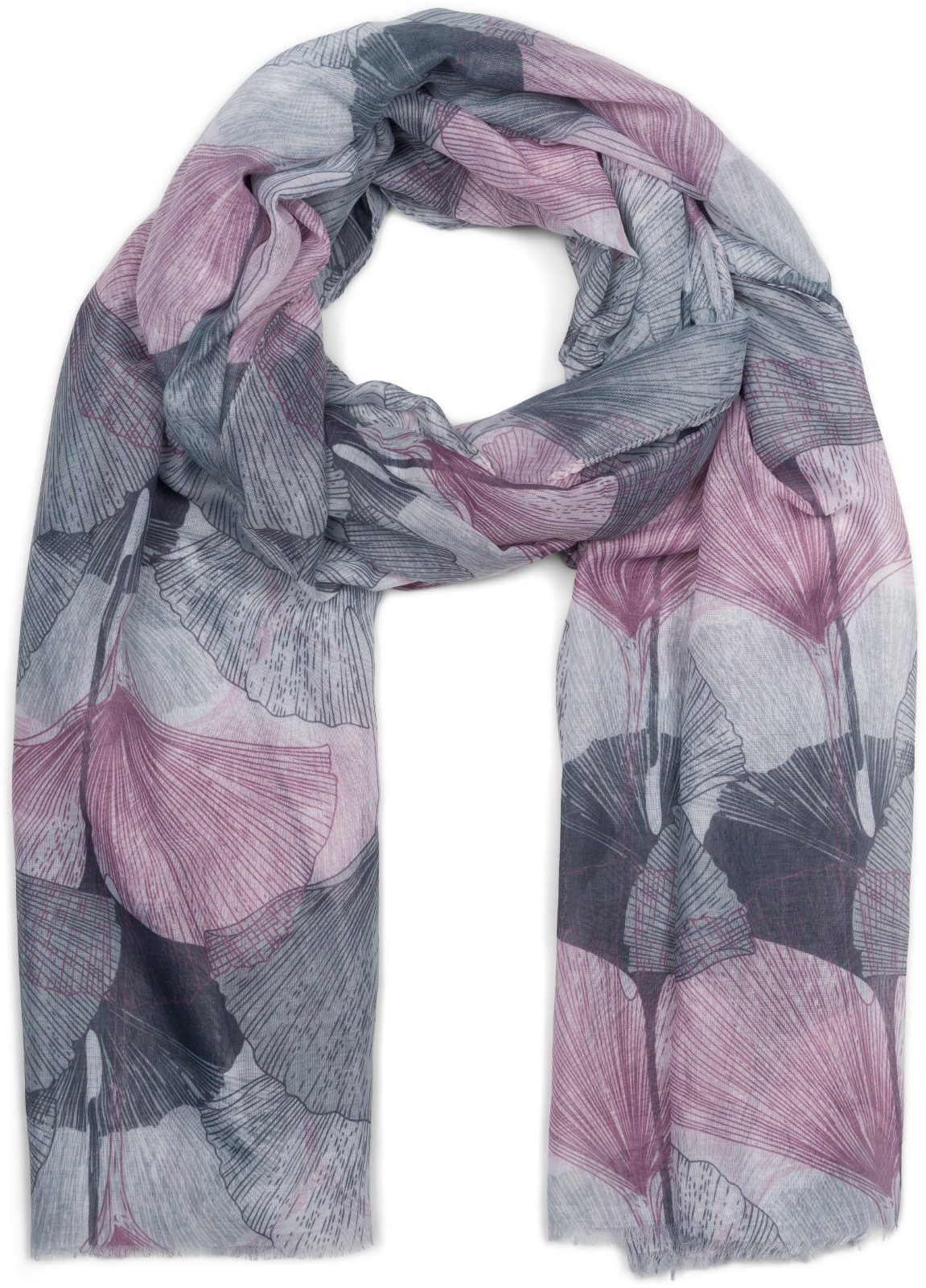 styleBREAKER edler weicher Schal mit mehrfarbigem Ginkgo Leaves Muster Print und kurzen Fransen.