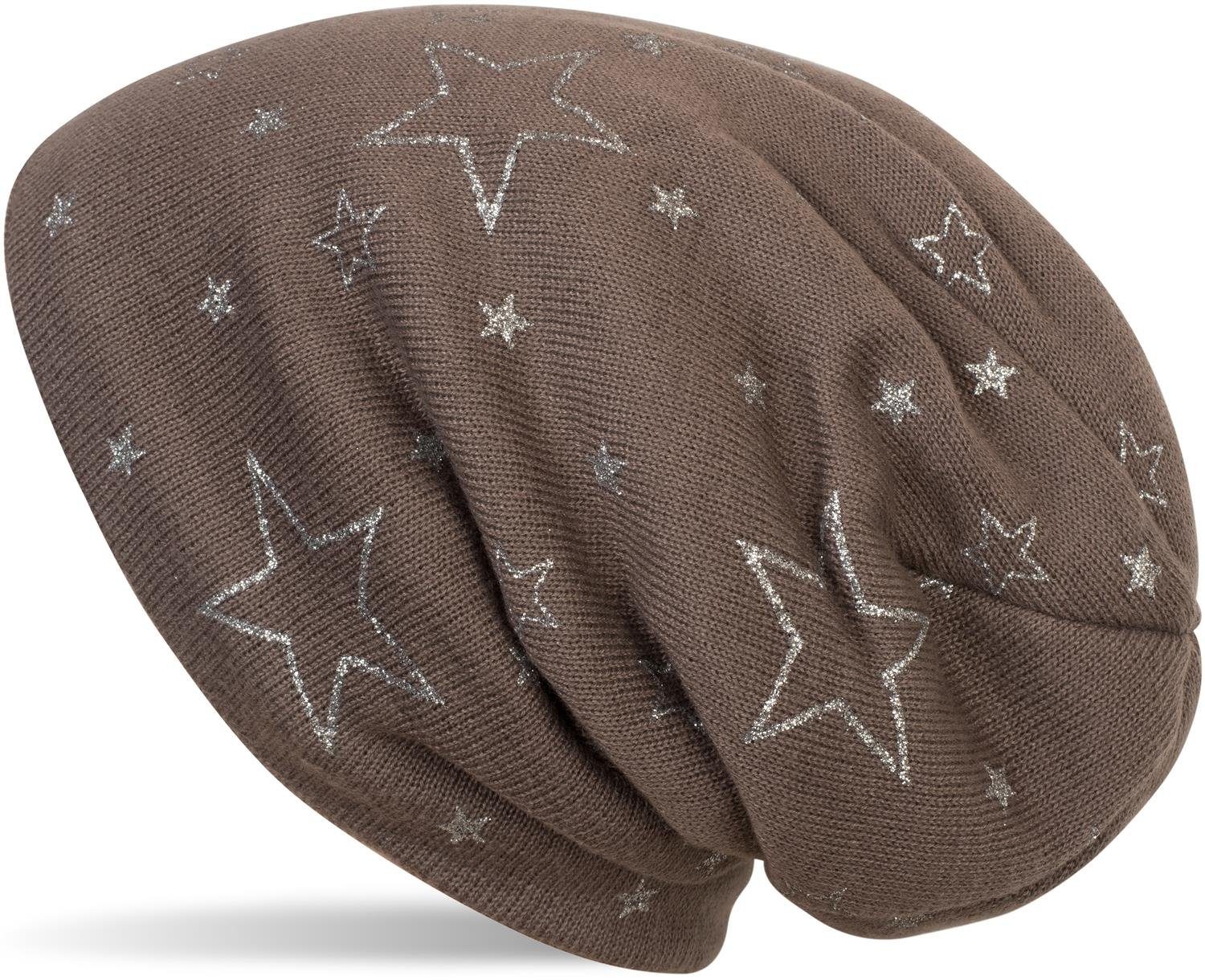 styleBREAKER stylische Feinstrick Beanie Mütze mit All Over Glitzer Stern Print und warmen Fleece Innenfutter.