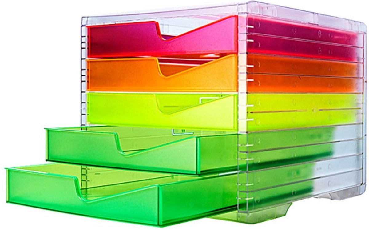 • styroswingbox NEONline, Pfiffige Trendbox setzt leuchtende Akzente auf dem Schreibtisch, mit 5 neonfarbigen Schubladen, Schubladen mit Auszugsstopp, leicht stapelbar, für Formate bis C4, Schubladeninnenmaße: 234 x 38 x 323 mm (B x H x T), Aussenabmessung Box: 270 x 255 x 340 mm (B x H x T), Farbe transaprent/multicolor