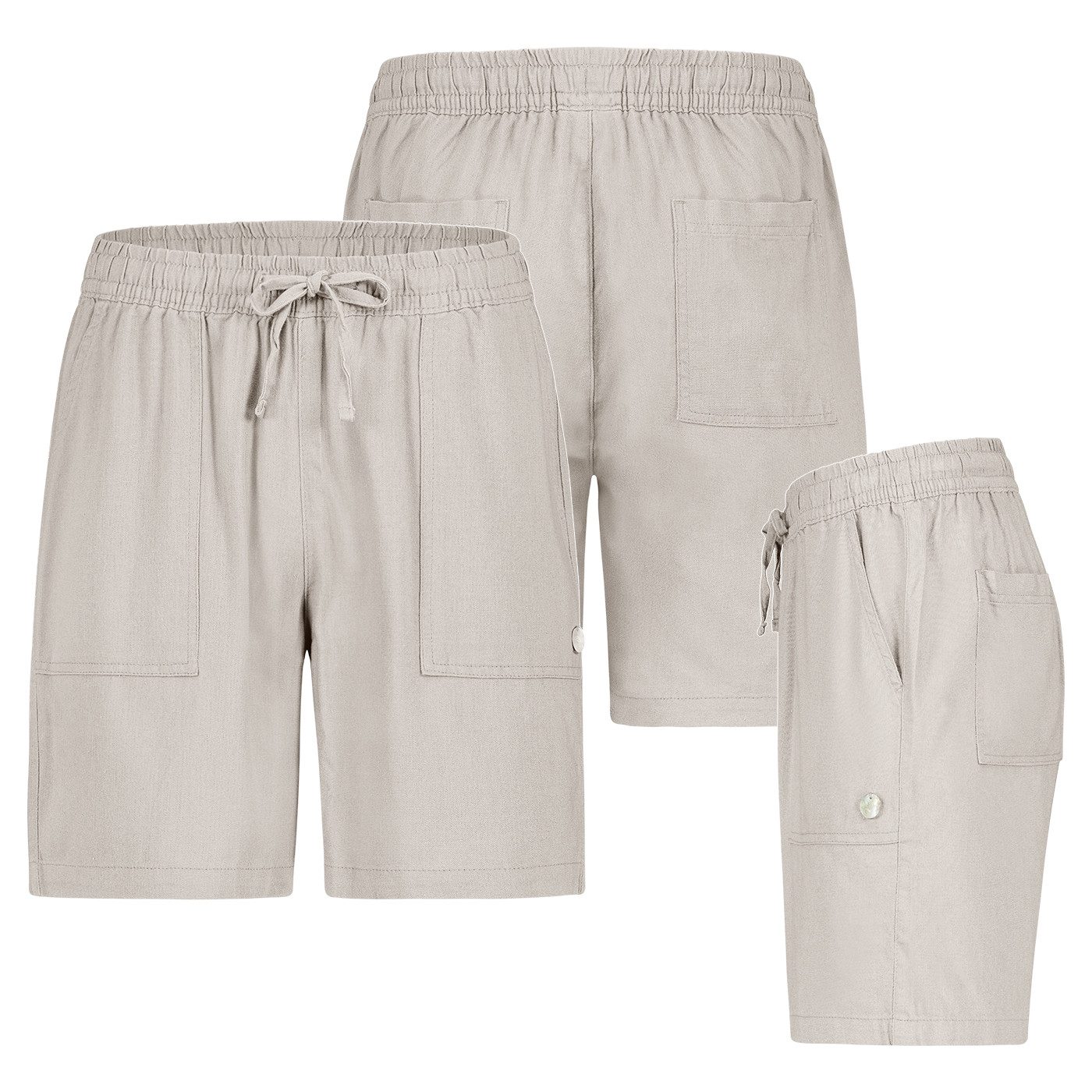 Die elastische Bundverarbeitung mit Bindekordel erlaubt eine flexible Passform und komfortablen Sitz – perfekt zum Hineinschlüpfen. Zwei seitliche Eingrifftaschen bieten Platz für Handy, Schlüssel oder andere Kleinigkeiten, während zwei aufgesetzte Gesäßtaschen den sportlich-lässigen Stil unterstreichen. Der Schnitt ist locker und bequem – ohne aufzutragen – und macht die Shorts zu einem Allrounder für Freizeit, Urlaub, Spaziergänge oder sommerliche City-Outfits.