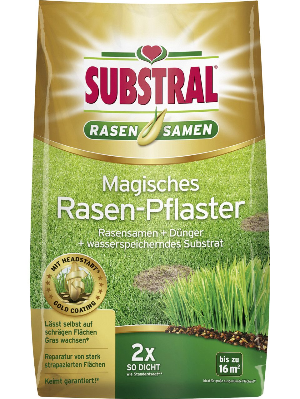 Einen Traumrasen zu erzielen ist oft eine große Herausforderung.Substral Magisches Rasen-Pflaster ist die Erste Hilfe für Ihrem Rasen - Häufig bilden sich kahle Stellen und Lücken im Rasen, in denen sich ohne Behandlung schnell Unkräuter ansiedeln können. Substral Magisches Rasen-Pflaster ist eine innovative 4 in 1 Reparatur-Kombination, die Ihnen hilft, auch auf schwierigsten Flächen einen dichten, schönen Rasen heranzuziehen. Als praktische, anwendungsfertige Mischung aus Rasensaat, Premium Keimsubstrat, SUBSTRAL Dünger sowie einem Haftmittel, welches die Anwendung selbst auf abschüssigen Flächen ermöglicht.Die 4 in 1 Komplettlösung wächst auf allen Böden! mit Headstart Gold Coating - Saatgutumhüllung mit Meeresalgenextrakt sowie Phosphat und Spurenelemente begünstigt die Keimung und Entwicklung, Wasser- und Nährstoffaufnahme sowie Bewurzelung der Rasengräser.Kahle Stellen im Rasen einfach ausbessern - Abgestorbenes Gras entfernen und Boden lockern, Substral Magisches Rasen-Pflaster gleichmäßig ausbringen, gut wässern. Das einzigartige Ausgangsmaterial, ein spezielles Granulat aus der Schale der Kokosnuss, nimmt das Wasser wie einen Schwamm auf, hält die Grassamen feucht und schließt sie in eine Schutzschicht ein. Zusammen mit dem enthaltenen Dünger werden die Samen ideal mit Wasser und Nährstoffen versorgt. Sie keimen und entwickeln sich dadurch schneller. Nachsaaten dürfen nicht austrocknen.Dank Substral Magisches Rasen-Pflaster ist das Wässern ganz einfach: Bekommt das Keimsubstrat eine hellbraune Farbe, wässern Sie erneut, bis es sich dunkelbraun färbt.