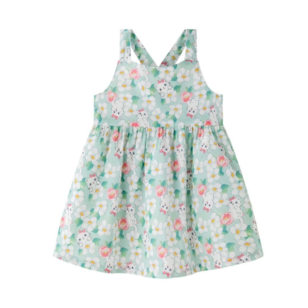 Baby-Mädchenkleid mit Trägern, mit Rücken. Aus 100 % Baumwollstoff mit Kätzchen-Print.