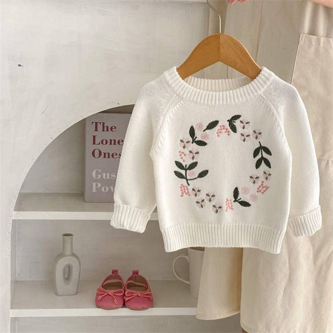 Mit süßer, floraler Stickerei und dem zeitlosen Strickmuster eignet sich der Pullover perfekt für unterschiedliche Anlässe