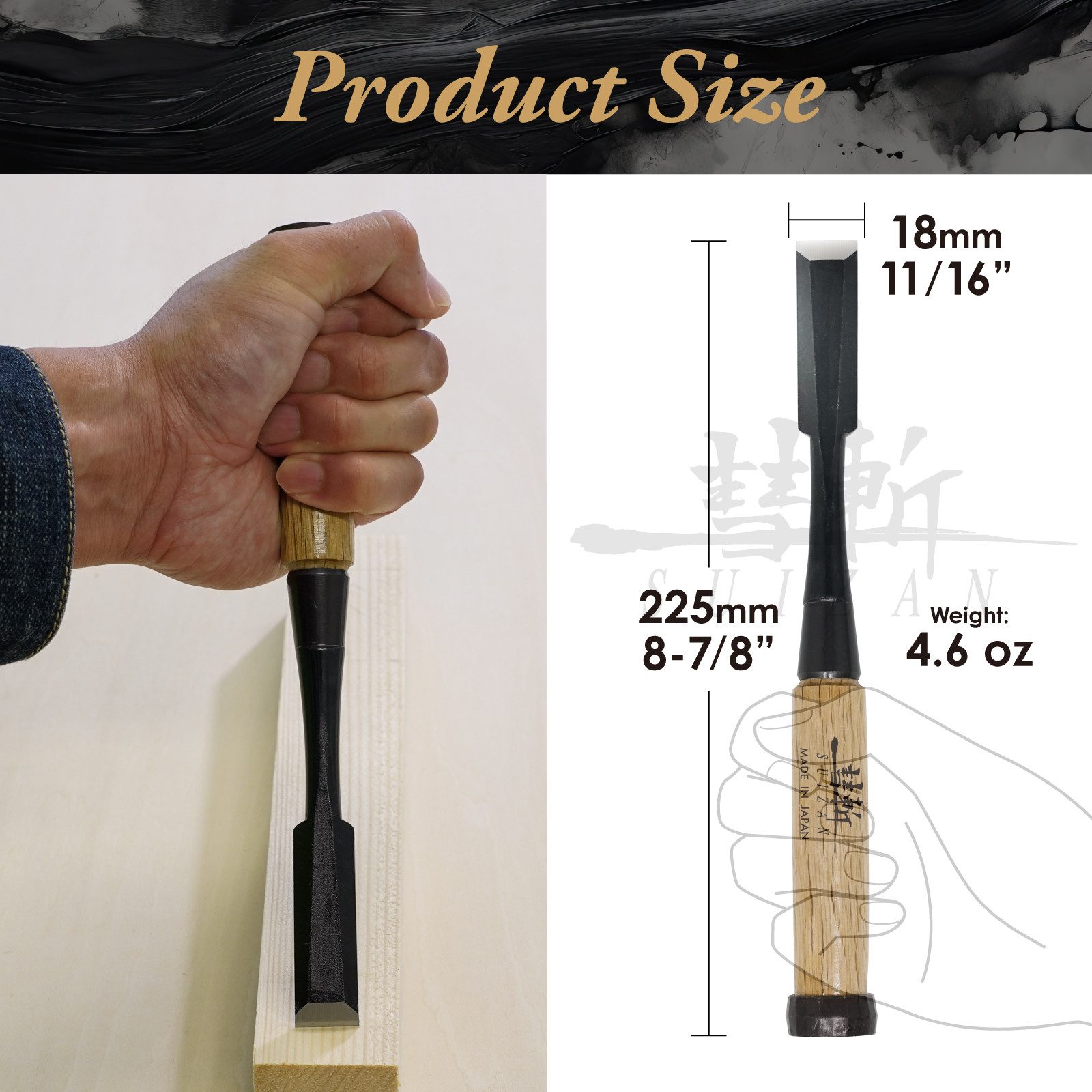 JAPANISCHER HOLZMEISSEL Dies ist ein hochwertiger japanischer Holzmeißel von SUIZAN. Er ist für das präzise Schneiden und Formen von Holz konzipiert und kann für eine Vielzahl von Aufgaben wie Stemmen, Meißeln und Glätten verwendet werden. JAPANISCHER STAHL Er besteht aus einer hochwertigen Superlegierung mit einer präzisen und scharfen Kante. Die Klinge wurde mit traditionellen Techniken gehärtet und von erfahrenen Handwerkern geschärft und ist rasiermesserscharf. HERGESTELLT IN JAPAN Все SUIZAN-Produkte werden in Japan von japanischen Meisterhandwerkern hergestellt. Der gesamte Herstellungsprozess dieser Werkzeuge wird in einer der Städte Japans durchgeführt, die für ihre Handwerkstradition mit einer über 150-jährigen Geschichte bekannt ist. BRINGEN SIE ABWECHSLUNGSREICHER ARBEITEN IN IHR LEBEN ALS HOLZBEARBEITER Egal, ob Sie ein Meister oder ein Anfänger sind, die Verwendung traditioneller japanischer Holzmeißel bietet Ihnen eine brandneue Erfahrung und ermöglicht Ihnen die Herstellung einer größeren Auswahl an Holzbearbeitungsprodukten, wodurch sich Ihr Leben verändert! SPEZIFIKATIONEN für Bauarbeiten wie Stemmen, Hobeln, Hacken, Schälen und eine Vielzahl anderer Holzbearbeitungsaufgaben.