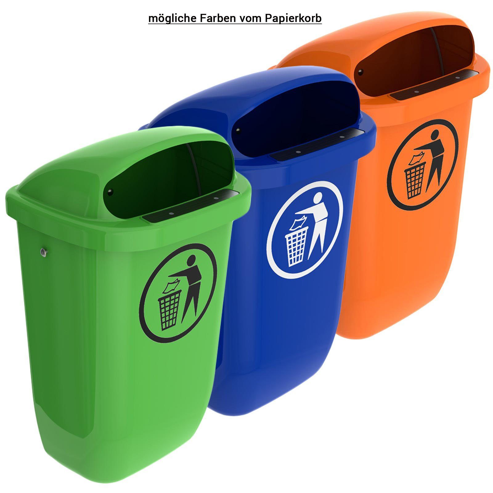 MATERIAL UND KONSTRUKTION: Kunststoffteile aus speziell entwickeltem Kunststoff im Spritzgussverfahren hergestellt | Verrottungsfest, resistent gegen Frost, Wärme und viele Chemikalien | Alterungsbeständig durch UV-Stabilisatoren | Metallteile korrosionsbeständig (Beschlagteile verzinkt) | Farben: Grün - Orange - Blau - Sonderfarben auf Wunsch lieferbar | Mit 2 Befestigungsschellen & 1 Dreikantschlüssel HANDLING: Haube zum Schutz vor Regen | Verhinderung des Einwurfs von sperrigem Abfall | Reinigungsfreundliche, glatte Oberfläche | Tragebügel und Griffmulde im Boden | Einfache, restlose und hygienische Entleerung durch Tragebügel | Verzinkte Stahlplatte am Rand zum Ausdrücken von Zigaretten | Auffällige Farbgebung mit Signalcharakter QUALITÄT UND UMWELT: Made in Germany | Zertifizierte Managementsysteme | Hochwertige Materialien und sorgfältige Verarbeitung für langjährige Funktionssicherheit | Все Behälterkomponenten sind recyclebar | Farben umweltverträglich und cadmiumfrei ÖFFNEN UND ENTLEEREN: Nachdem das Schloss geöffnet wurde, schwenkt die Haube durch Federkraft selbstständig nach oben. Der Rumpf kippt nach vorne und kann mit Hilfe eines Tragebügels entnommen werden, dabei hilft zudem eine Griffmulde im Rumpfboden. Der entleerte Rumpf wird wieder auf den Niet des Befestigungsbleches gesteckt und nach hinten gedrückt. Zum Verschließen des Abfallbehälters wird die Haube bis zum Einrasten heruntergezogen WANDMONTAGE: Bei der Wandmontage des Papierkorbes wird das Befestigungsblech mit vier Schrauben (Schrauben sind nicht im Lieferumfang) an der Wand befestigt. PFOSTENMONTAGE: Der Abfallbehälter wird mit zwei Schellen am Pfosten oder Laternenmast befestigt. Mit den Universalschellen kann der Papierkorb an Pfosten mit einem Durchmesser von 50 bis 275 mm mühelos befestigt werden