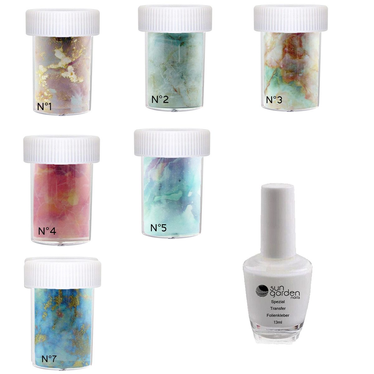 Entdecken Sie kreatives Nageldesign auf einem neuen Level – mit dem exklusiven Sun Garden Nails MARBLE SET 7! Dieses vielseitige Set vereint sechs hochwertige Transfer-Nagelfolien im angesagten Marmorlook (Nr. 01, 02, 03, 04, 05, 07) mit einem speziell entwickelten Nagelfolienkleber. Jede Folie bringt ein individuelles Marmordesign mit, das Ihre Nägel in kunstvolle Blickfänge verwandelt – edel, modern und absolut im Trend. Die Anwendung ist denkbar einfach: Schneiden Sie die gewünschte Размер aus der Folie, tragen Sie den beiliegenden Spezialkleber gezielt auf und drücken Sie die Folie gleichmäßig an. Überschüsse können vorsichtig abgefeilt werden – für ein sauberes, professionelles Finish. Der hochwertige Kleber sorgt für maximale Haftung und ist sowohl für Naturnägel als auch für modellierte Nägel mit UV Gel oder Acryl geeignet. Er trocknet schnell, lässt sich präzise auftragen und garantiert ein langanhaltendes Ergebnis. Ob Sie Anfänger oder Profi im Bereich Nail Art sind – dieses Set ist ideal für kreative Designs mit Wow-Effekt. Die Folien lassen sich perfekt kombinieren, individuell zuschneiden und flexibel einsetzen. Für den finalen Glanz und dauerhaften Schutz Ihrer Kreationen empfiehlt sich eine Versiegelung mit UV-Topcoat, wie dem UV Quick Finish von Sun Garden Nails. Gönnen Sie sich oder Ihren Kundinnen ein Nageldesign der Extraklasse – mit dem Sun Garden Nails Marble Set 7 bringen Sie Salonqualität direkt nach Hause. Lassen Sie Ihrer Kreativität freien Lauf und kreieren Sie Looks, die garantiert in Erinnerung bleiben!