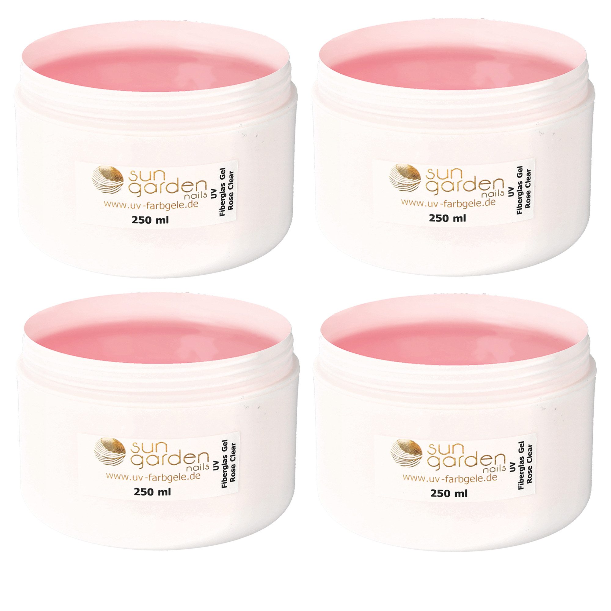 LED / UV Fiberglas Gel rose klar - 1-Phasen Gel - 4x250ml Das UV Fiberglas Gel in der Farbe Rose Klar von Sun Garden Nails ist ein hochwertiges 1-Phasen Gel, das speziell für die professionelle Nagelmodellage entwickelt wurde. Mit einem Inhalt von 1000 ml bietet dieses Produkt eine ausreichende Menge, um zahlreiche Anwendungen durchzuführen und perfekte Ergebnisse zu erzielen.Das besondere an diesem Gel ist seine einzigartige Formel, die aus hochwertigen Inhaltsstoffen besteht. Das Fiberglas Gel enthält feine Glasfasern, die dem Nagel zusätzliche Stabilität verleihen und so für eine langanhaltende Haltbarkeit sorgen. Durch diese verstärkte Struktur wird der Naturnagel vor Brüchen und Absplitterungen geschützt.Dank seiner rosafarbenen Transparenz eignet sich das UV Fiberglas Gel besonders gut für natürliche French Manicure Looks oder als Basis für Nail Art Designs. Es lässt sich einfach auftragen und modellieren, sodass auch Anfängerinnen tolle Ergebnisse erzielen können. Die Aushärtungszeit beträgt ca. 2 Minuten unter einer UV-Lampe oder ca. 60 Sekunden unter einer LED-Lampe – die je nach gewünschter Intensität des Glanzes kann die Aushärtungszeit angepasst werden.Ein weiterer Vorteil dieses Gels ist seine hohe Flexibilität nach dem Aushärten. Dadurch passt es sich den natürlichen Bewegungen des Nagels an und verhindert das Abplatzen oder Brechen der Modellage bei Belastung im Alltag. Das UV Fiberglas Gel rose klar von Sun Garden Nails ist sowohl für den professionellen Einsatz im Nagelstudio als auch für den privaten Gebrauch geeignet. Es überzeugt durch eine hohe Qualität, einfache Anwendung und ein lang anhaltendes Ergebnis.Insgesamt ist das UV Fiberglas Gel rose klar von Sun Garden Nails die perfekte Wahl für alle, die auf der Suche nach einem hochwertigen und langlebigen Gel sind, das sowohl natürliche Looks als auch kreative Nail Art Designs ermöglicht. Mit diesem Produkt gelingt Ihnen garantiert eine professionelle Nagelmodellage!