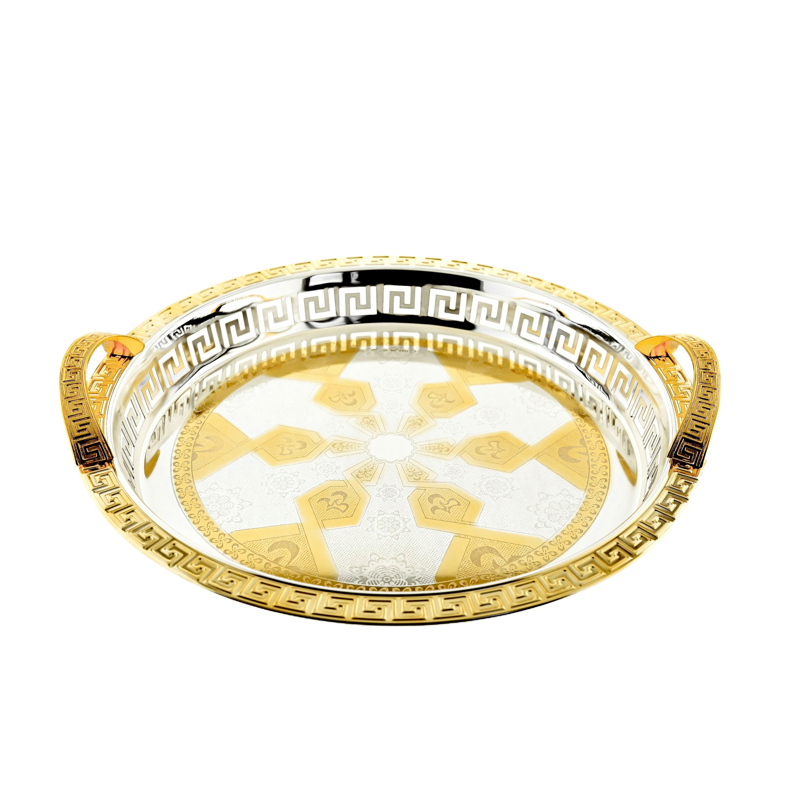 Dieses Serviertablett vereint Eleganz und Funktionalität in perfekter Harmonie. Gefertigt aus hochwertigem Edelstahl strahlt es Langlebigkeit und Stil aus. Das silberne Finish des Tabletts wird durch ein goldenes Muster akzentuiert, das ihm einen Hauch von Luxus verleiht. Das Edelstahlmaterial macht das Tablett leicht zu reinigen und pflegeleicht, sodass Sie es immer wieder verwenden können, ohne dass es an Glanz verliert.