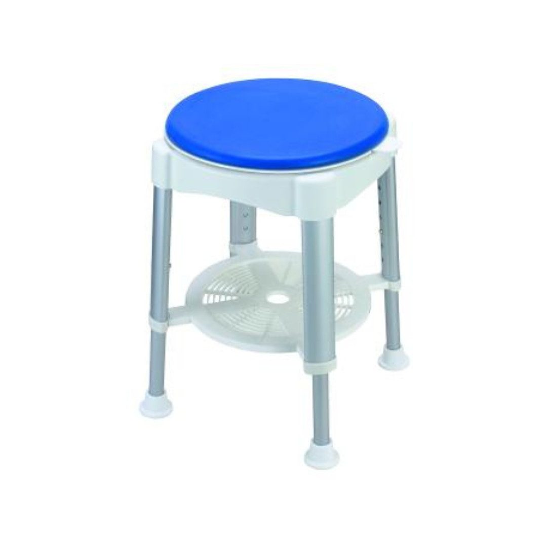 Sundo - Duschhocker mit Soft Drehscheibe Duschhocker mit integrierter Soft Drehscheibe und Ablagefach, Aluminiumrahmen, höhenverstellbar Dieser Duschhocker ist die perfekte Hilfe bei der täglichen Körperpflege. Er besitzt eine integrierte Soft-Drehscheibe, welche 4-fach arretierbar ist und das Sitzen angenehm macht. Durch diese Drehscheibe ist ein einfaches Umsetzen und Herumdrehen um 360° möglich. Der Duschhocker ist siebenfach höhenverstellbar und besitzt zusätzlich eine Ablage unter der Sitzfläche, wo sich die Badutensielien verstauen lassen. Seine großen, runden Gummifüße sorgen dafür, dass der Duschhocker auch im Nassbereich sehr sicher steht. Ob für die Dusche oder als Sitzhilfe vor dem Waschtisch - eine praktische Hilfe. Mit seiner großen Sitzfläche und einer maximalen Belastbarkeit von 150kg ist er auch für schwerere Personen geeignet. Merkmale/Komponenten Siebenfach höhenverstellbar. Rutschsichere Füße. Rostfrei. Inklusive Soft Drehplatte, 4-fach arretierbar. Ablagefach unter der Sitzfläche. werkzeugfreie Montage. 360°-Rotationsfunktion. Einfach zu reinigen. Farbe: Weiß/Blau. Technische Daten Gesamttiefe: 40 cm Gesamtbreite: 40 cm Sitzfläche d=35 cm Sitzhöhe: 42-58 cm Gewicht: 3,2 kg Maximale Belastbarkeit: 150 kg
